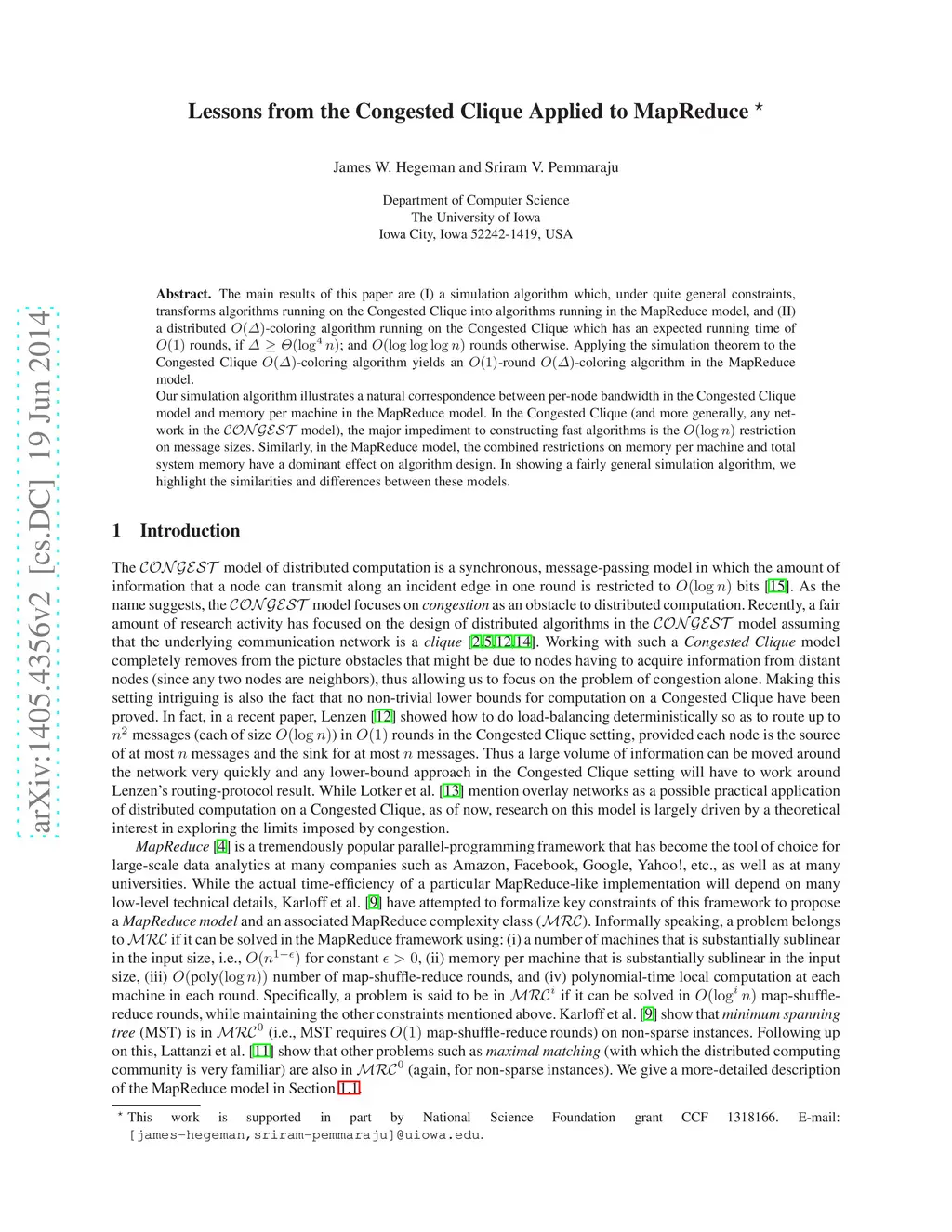 The main results of this paper are (I) a simulation algorithm which, under quite general constraints, transforms algorithms running on the Congested Clique into algorithms running in the MapReduce model, and (II) a distributed -coloring algorithm running on the Congested Clique which has an expected running time of (i) rounds, if ; and (ii) rounds otherwise. Applying the simulation theorem to the Congested-Clique -coloring algorithm yields an -round -coloring algorithm in the MapReduce model. Our simulation algorithm illustrates a natural correspondence between per-node bandwidth in the Congested Clique model and memory per machine in the MapReduce model. In the Congested Clique (and more generally, any network in the model), the major impediment to constructing fast algorithms is the restriction on message sizes. Similarly, in the MapReduce model, the combined restrictions on memory per machine and total system memory have a dominant effect on algorithm design. In showing a fairly general simulation algorithm, we highlight the similarities and differences between these models.