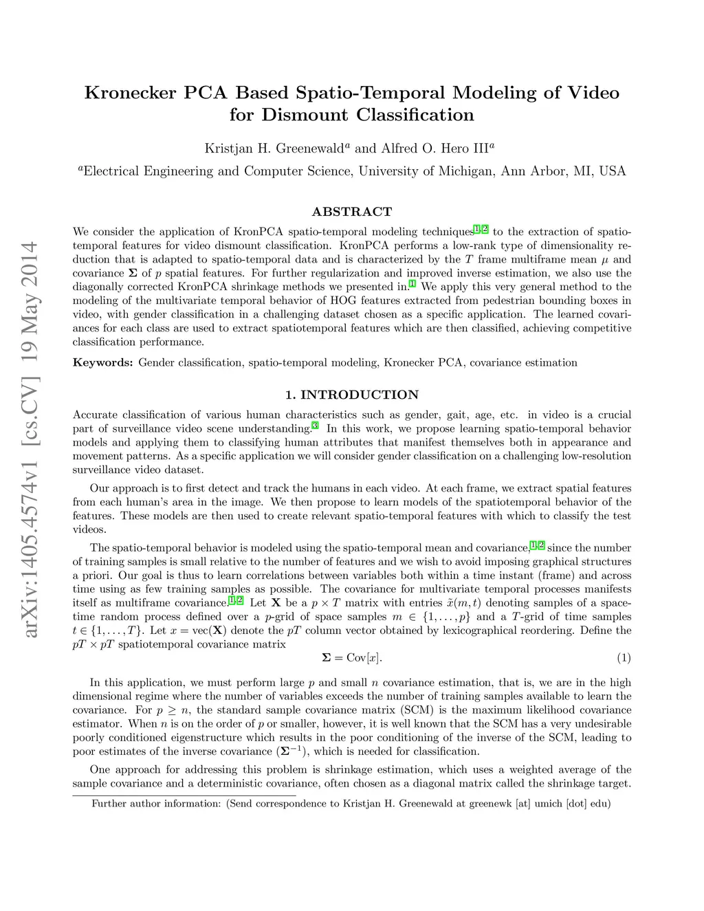 We consider the application of KronPCA spatio-temporal modeling techniques [Greenewald et al 2013, Tsiligkaridis et al 2013] to the extraction of spatiotemporal features for video dismount classification. KronPCA performs a low-rank type of dimensionality reduction that is adapted to spatio-temporal data and is characterized by the T frame multiframe mean and covariance of p spatial features. For further regularization and improved inverse estimation, we also use the diagonally corrected KronPCA shrinkage methods we presented in [Greenewald et al 2013]. We apply this very general method to the modeling of the multivariate temporal behavior of HOG features extracted from pedestrian bounding boxes in video, with gender classification in a challenging dataset chosen as a specific application. The learned covariances for each class are used to extract spatiotemporal features which are then classified, achieving competitive classification performance.