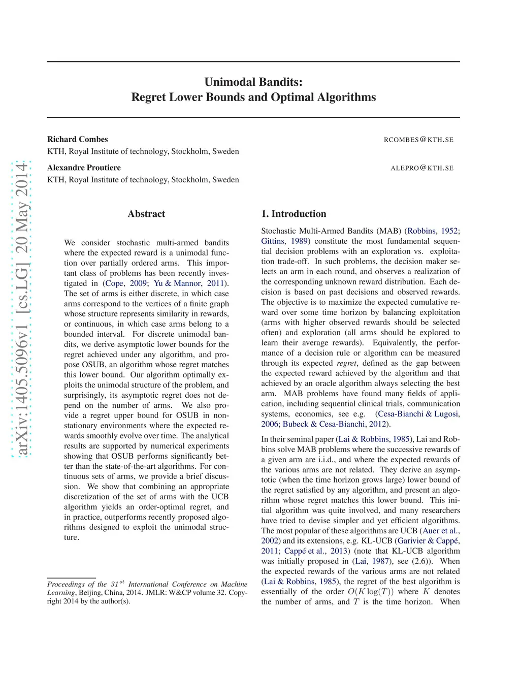 We consider stochastic multi-armed bandits where the expected reward is a unimodal function over partially ordered arms. This important class of problems has been recently investigated in (Cope 2009, Yu 2011). The set of arms is either discrete, in which case arms correspond to the vertices of a finite graph whose structure represents similarity in rewards, or continuous, in which case arms belong to a bounded interval. For discrete unimodal bandits, we derive asymptotic lower bounds for the regret achieved under any algorithm, and propose OSUB, an algorithm whose regret matches this lower bound. Our algorithm optimally exploits the unimodal structure of the problem, and surprisingly, its asymptotic regret does not depend on the number of arms. We also provide a regret upper bound for OSUB in non-stationary environments where the expected rewards smoothly evolve over time. The analytical results are supported by numerical experiments showing that OSUB performs significantly better than the state-of-the-art algorithms. For continuous sets of arms, we provide a brief discussion. We show that combining an appropriate discretization of the set of arms with the UCB algorithm yields an order-optimal regret, and in practice, outperforms recently proposed algorithms designed to exploit the unimodal structure.
