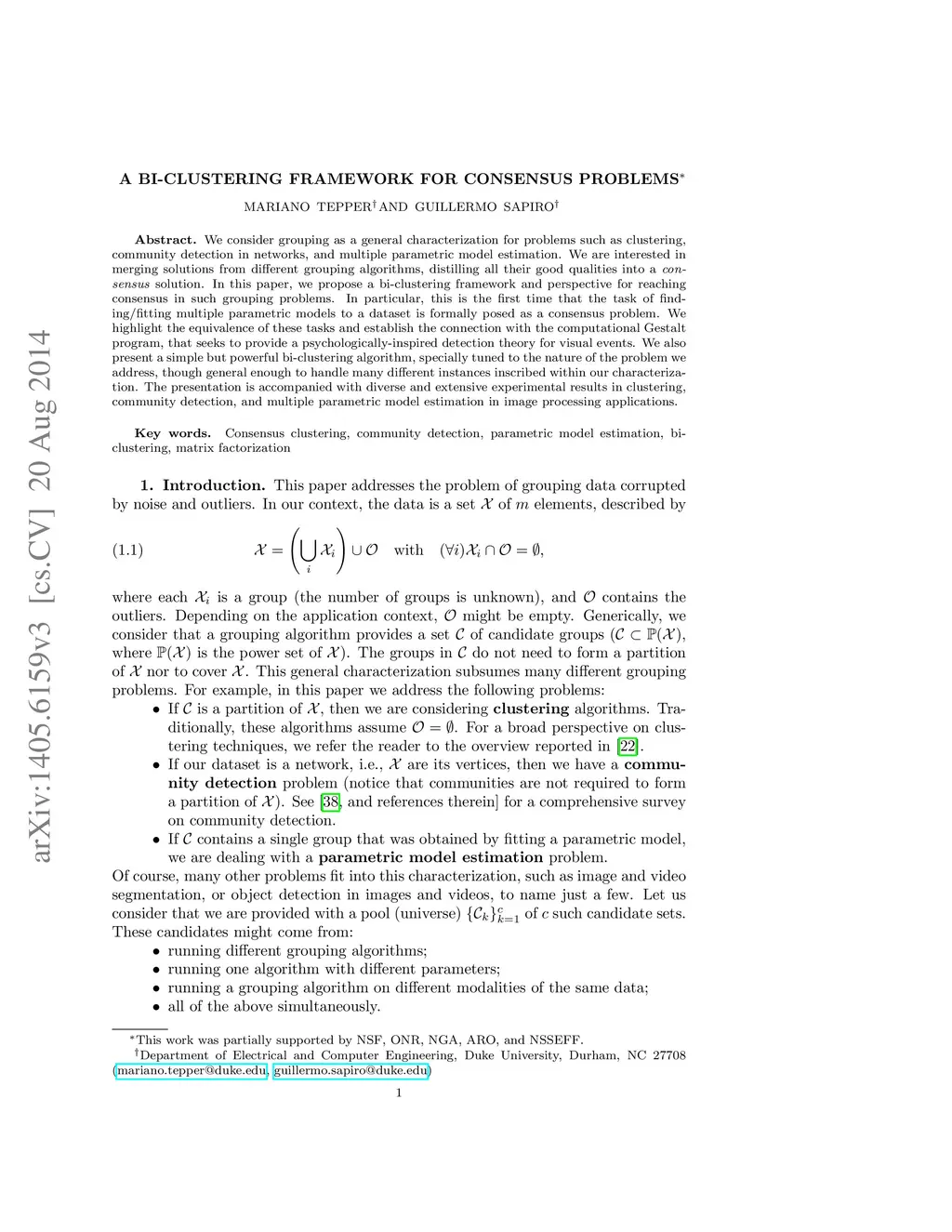 We consider grouping as a general characterization for problems such as clustering, community detection in networks, and multiple parametric model estimation. We are interested in merging solutions from different grouping algorithms, distilling all their good qualities into a consensus solution. In this paper, we propose a bi-clustering framework and perspective for reaching consensus in such grouping problems. In particular, this is the first time that the task of finding/fitting multiple parametric models to a dataset is formally posed as a consensus problem. We highlight the equivalence of these tasks and establish the connection with the computational Gestalt program, that seeks to provide a psychologically-inspired detection theory for visual events. We also present a simple but powerful bi-clustering algorithm, specially tuned to the nature of the problem we address, though general enough to handle many different instances inscribed within our characterization. The presentation is accompanied with diverse and extensive experimental results in clustering, community detection, and multiple parametric model estimation in image processing applications.