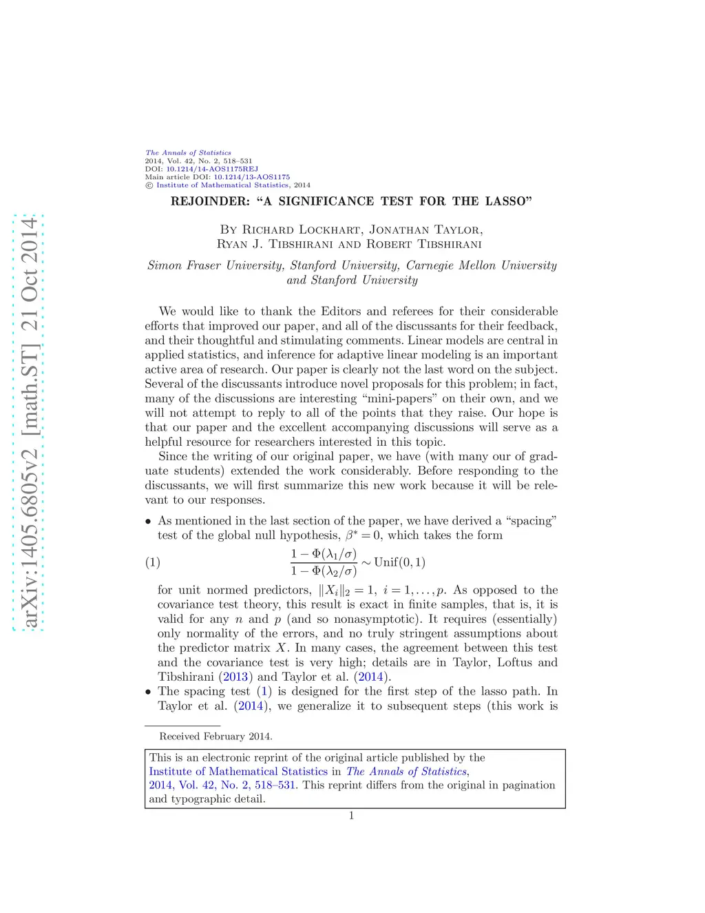 Rejoinder of "A significance test for the lasso" by Richard Lockhart, Jonathan Taylor, Ryan J. Tibshirani, Robert Tibshirani [arXiv:1301.7161].