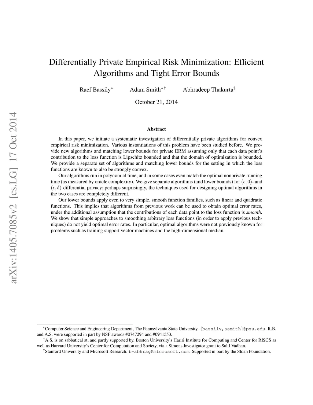 In this paper, we initiate a systematic investigation of differentially private algorithms for convex empirical risk minimization. Various instantiations of this problem have been studied before. We provide new algorithms and matching lower bounds for private ERM assuming only that each data point's contribution to the loss function is Lipschitz bounded and that the domain of optimization is bounded. We provide a separate set of algorithms and matching lower bounds for the setting in which the loss functions are known to also be strongly convex. Our algorithms run in polynomial time, and in some cases even match the optimal non-private running time (as measured by oracle complexity). We give separate algorithms (and lower bounds) for - and -differential privacy; perhaps surprisingly, the techniques used for designing optimal algorithms in the two cases are completely different. Our lower bounds apply even to very simple, smooth function families, such as linear and quadratic functions. This implies that algorithms from previous work can be used to obtain optimal error rates, under the additional assumption that the contributions of each data point to the loss function is smooth. We show that simple approaches to smoothing arbitrary loss functions (in order to apply previous techniques) do not yield optimal error rates. In particular, optimal algorithms were not previously known for problems such as training support vector machines and the high-dimensional median.