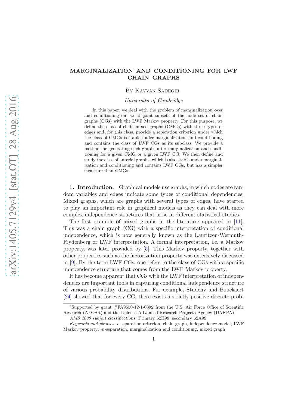 In this paper, we deal with the problem of marginalization over and conditioning on two disjoint subsets of the node set of chain graphs with LWF Markov property. For this purpose, we define the class of chain mixed graphs (CMGs) with three types of edges and, for this class, provide a separation criterion under which the class of CMGs is stable under marginalization and conditioning and contains the class of LWF chain graphs as its subclass. We provide a method for generating such graphs after marginalization and conditioning for a given CMG or a given LWF chain graph. We then define and study the class of anterial graphs, which is also stable under marginalization and conditioning and contains LWF CGs, but has a simpler structure than CMGs.