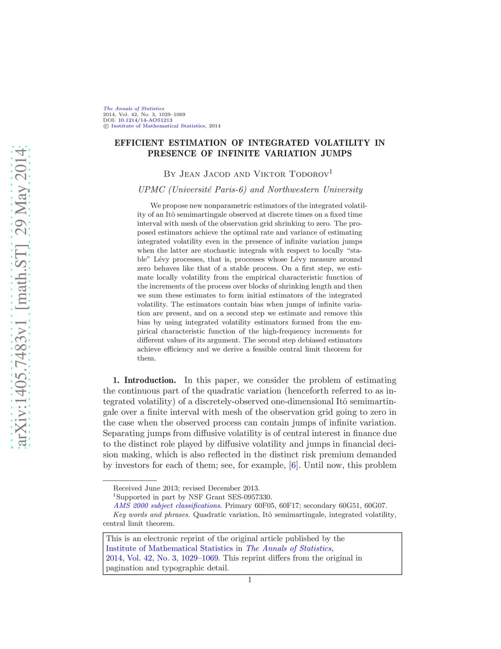 We propose new nonparametric estimators of the integrated volatility of an It\^{o} semimartingale observed at discrete times on a fixed time interval with mesh of the observation grid shrinking to zero. The proposed estimators achieve the optimal rate and variance of estimating integrated volatility even in the presence of infinite variation jumps when the latter are stochastic integrals with respect to locally "stable" L\'{e}vy processes, that is, processes whose L\'{e}vy measure around zero behaves like that of a stable process. On a first step, we estimate locally volatility from the empirical characteristic function of the increments of the process over blocks of shrinking length and then we sum these estimates to form initial estimators of the integrated volatility. The estimators contain bias when jumps of infinite variation are present, and on a second step we estimate and remove this bias by using integrated volatility estimators formed from the empirical characteristic function of the high-frequency increments for different values of its argument. The second step debiased estimators achieve efficiency and we derive a feasible central limit theorem for them.