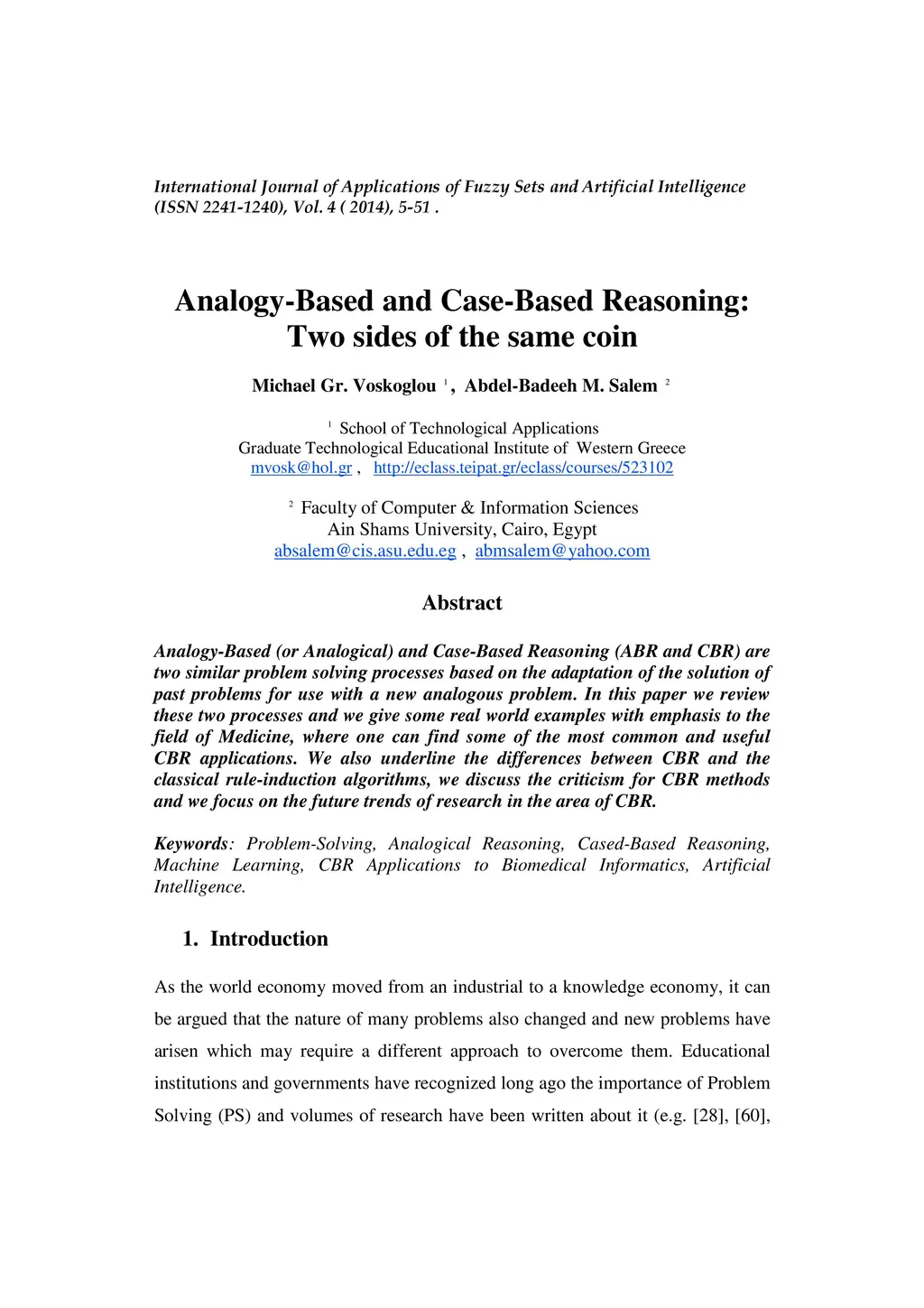 Analogy-Based (or Analogical) and Case-Based Reasoning (ABR and CBR) are two similar problem solving processes based on the adaptation of the solution of past problems for use with a new analogous problem. In this paper we review these two processes and we give some real world examples with emphasis to the field of Medicine, where one can find some of the most common and useful CBR applications. We also underline the differences between CBR and the classical rule-induction algorithms, we discuss the criticism for CBR methods and we focus on the future trends of research in the area of CBR.