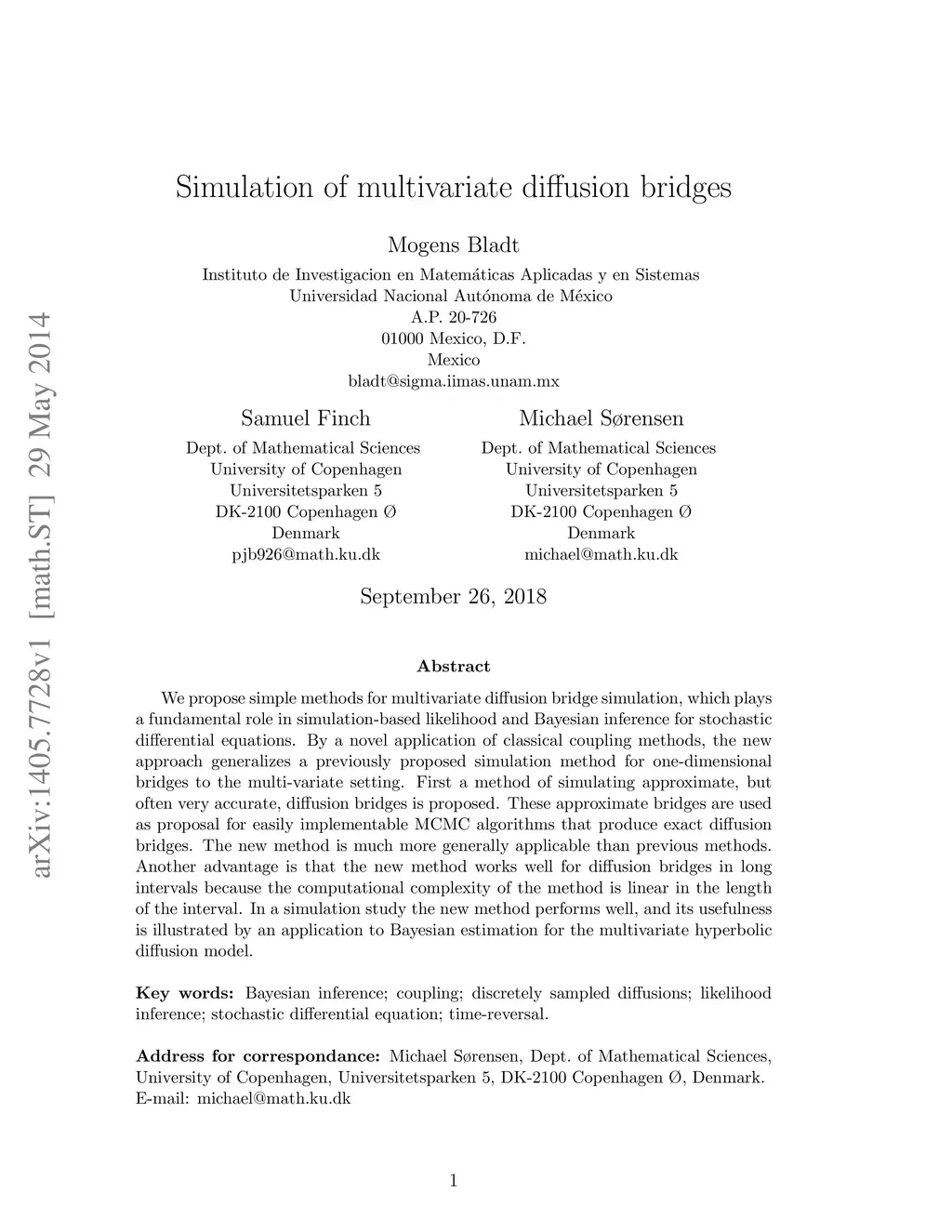 We propose simple methods for multivariate diffusion bridge simulation, which plays a fundamental role in simulation-based likelihood and Bayesian inference for stochastic differential equations. By a novel application of classical coupling methods, the new approach generalizes a previously proposed simulation method for one-dimensional bridges to the multi-variate setting. First a method of simulating approximate, but often very accurate, diffusion bridges is proposed. These approximate bridges are used as proposal for easily implementable MCMC algorithms that produce exact diffusion bridges. The new method is much more generally applicable than previous methods. Another advantage is that the new method works well for diffusion bridges in long intervals because the computational complexity of the method is linear in the length of the interval. In a simulation study the new method performs well, and its usefulness is illustrated by an application to Bayesian estimation for the multivariate hyperbolic diffusion model.