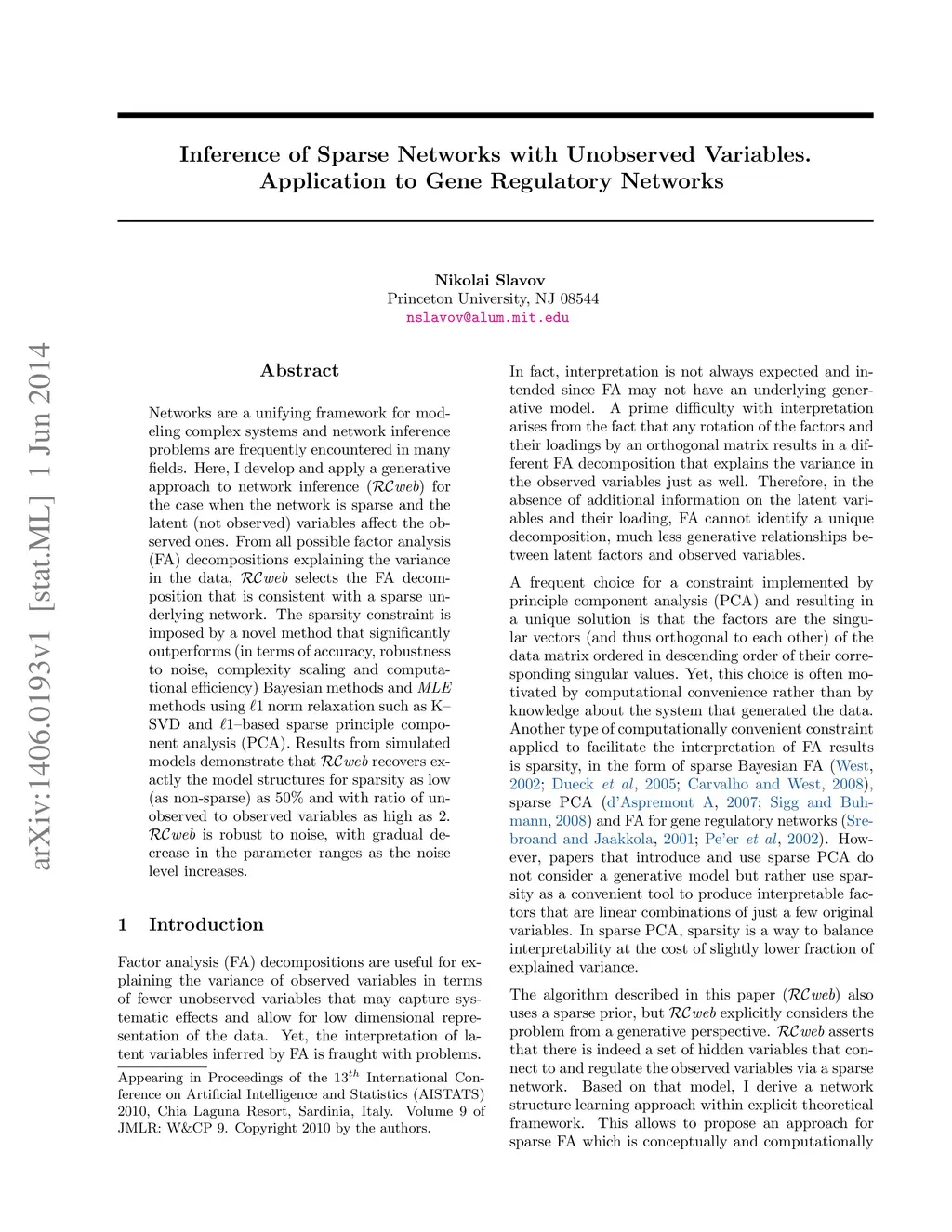 Networks are a unifying framework for modeling complex systems and network inference problems are frequently encountered in many fields. Here, I develop and apply a generative approach to network inference (RCweb) for the case when the network is sparse and the latent (not observed) variables affect the observed ones. From all possible factor analysis (FA) decompositions explaining the variance in the data, RCweb selects the FA decomposition that is consistent with a sparse underlying network. The sparsity constraint is imposed by a novel method that significantly outperforms (in terms of accuracy, robustness to noise, complexity scaling, and computational efficiency) Bayesian methods and MLE methods using l1 norm relaxation such as K-SVD and l1--based sparse principle component analysis (PCA). Results from simulated models demonstrate that RCweb recovers exactly the model structures for sparsity as low (as non-sparse) as 50% and with ratio of unobserved to observed variables as high as 2. RCweb is robust to noise, with gradual decrease in the parameter ranges as the noise level increases.