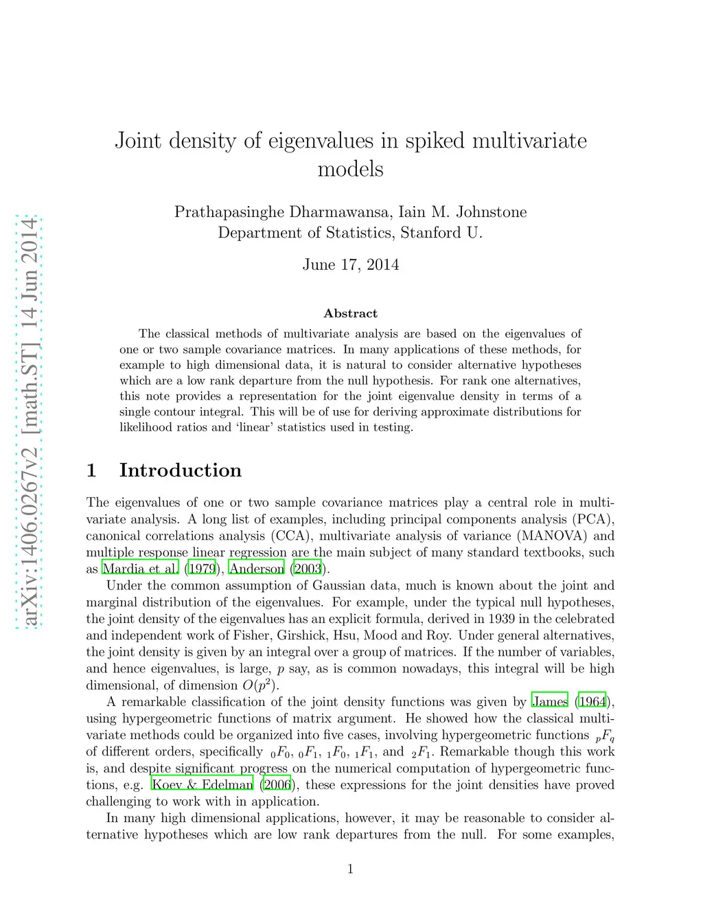 The classical methods of multivariate analysis are based on the eigenvalues of one or two sample covariance matrices. In many applications of these methods, for example to high dimensional data, it is natural to consider alternative hypotheses which are a low rank departure from the null hypothesis. For rank one alternatives, this note provides a representation for the joint eigenvalue density in terms of a single contour integral. This will be of use for deriving approximate distributions for likelihood ratios and linear statistics used in testing.