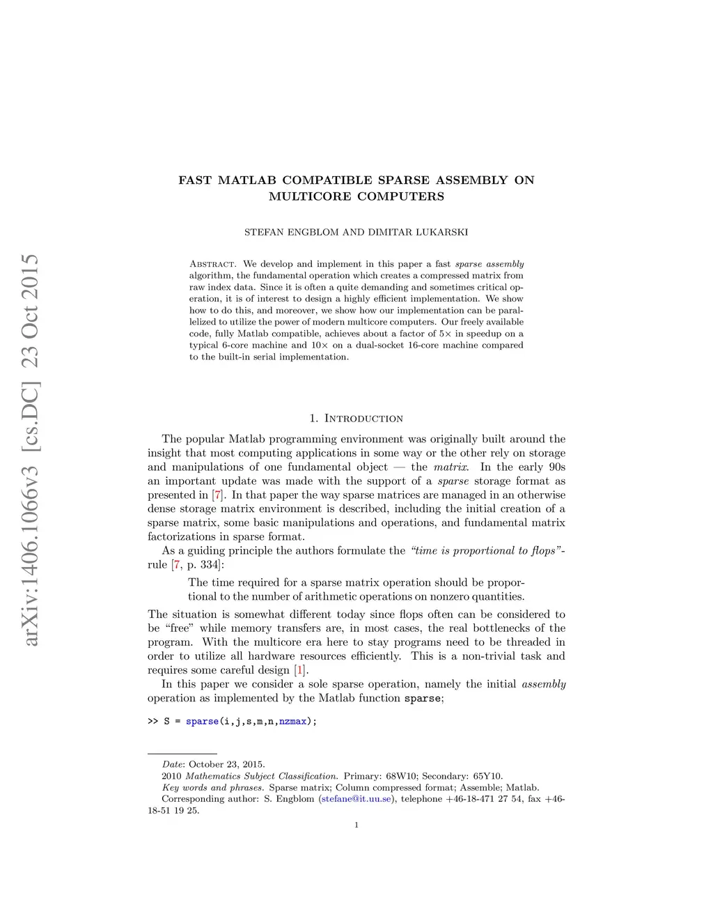 Fast Matlab compatible sparse assembly on multicore computers
