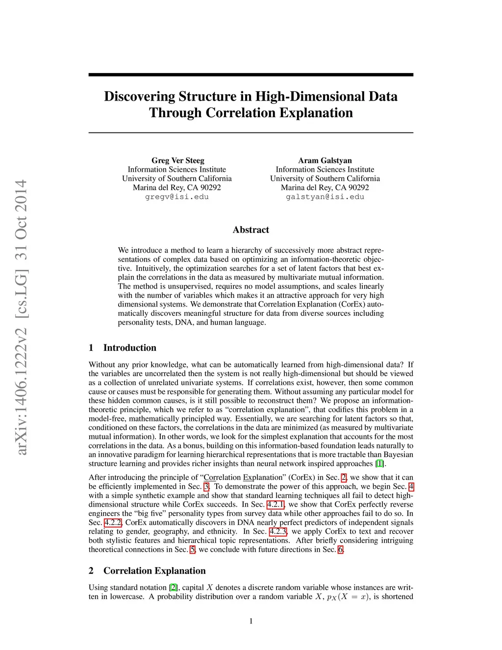 We introduce a method to learn a hierarchy of successively more abstract representations of complex data based on optimizing an information-theoretic objective. Intuitively, the optimization searches for a set of latent factors that best explain the correlations in the data as measured by multivariate mutual information. The method is unsupervised, requires no model assumptions, and scales linearly with the number of variables which makes it an attractive approach for very high dimensional systems. We demonstrate that Correlation Explanation (CorEx) automatically discovers meaningful structure for data from diverse sources including personality tests, DNA, and human language.