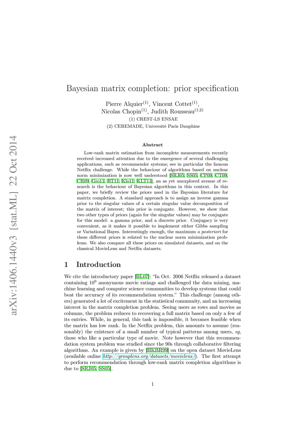 Low-rank matrix estimation from incomplete measurements recently received increased attention due to the emergence of several challenging applications, such as recommender systems; see in particular the famous Netflix challenge. While the behaviour of algorithms based on nuclear norm minimization is now well understood, an as yet unexplored avenue of research is the behaviour of Bayesian algorithms in this context. In this paper, we briefly review the priors used in the Bayesian literature for matrix completion. A standard approach is to assign an inverse gamma prior to the singular values of a certain singular value decomposition of the matrix of interest; this prior is conjugate. However, we show that two other types of priors (again for the singular values) may be conjugate for this model: a gamma prior, and a discrete prior. Conjugacy is very convenient, as it makes it possible to implement either Gibbs sampling or Variational Bayes. Interestingly enough, the maximum a posteriori for these different priors is related to the nuclear norm minimization problems. We also compare all these priors on simulated datasets, and on the classical MovieLens and Netflix datasets.