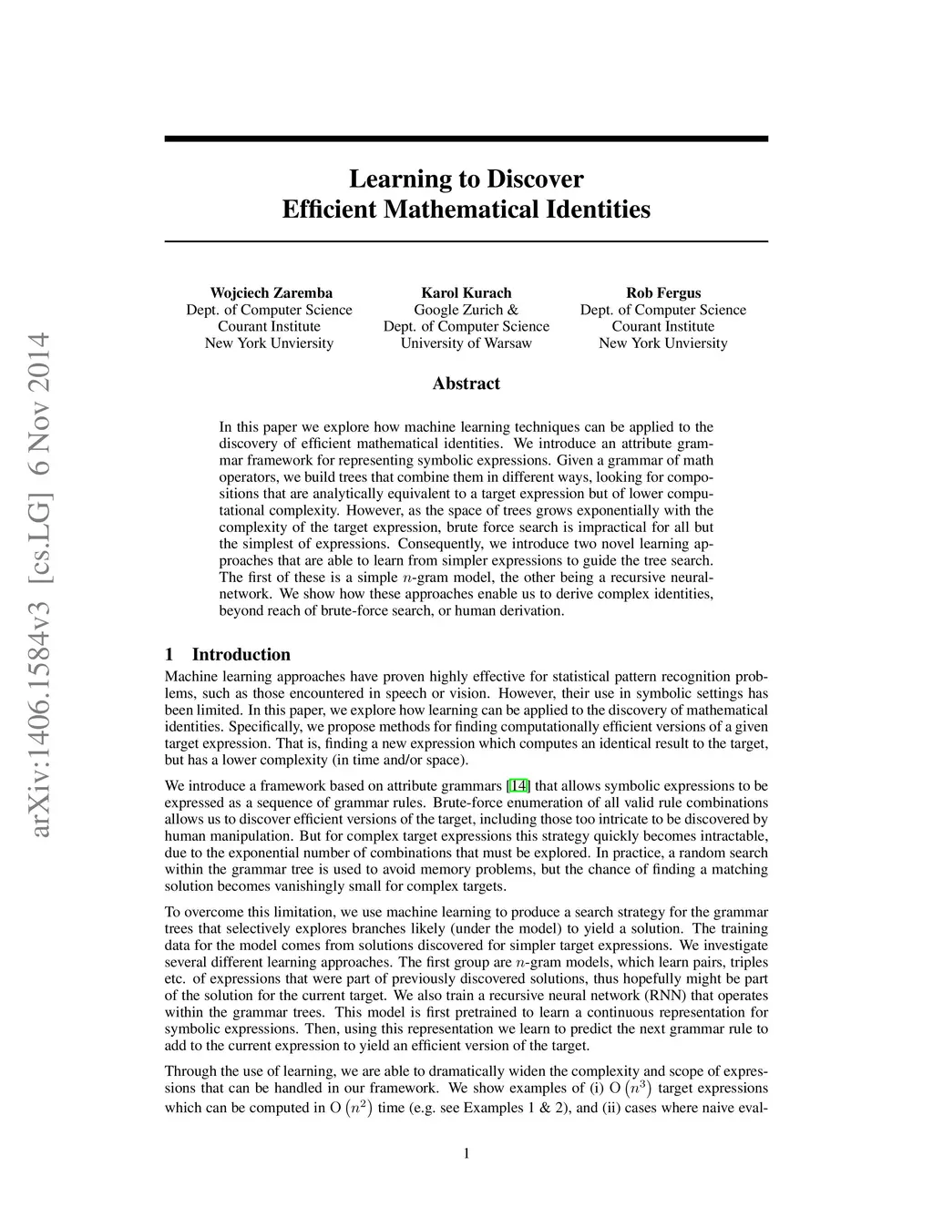 In this paper we explore how machine learning techniques can be applied to the discovery of efficient mathematical identities. We introduce an attribute grammar framework for representing symbolic expressions. Given a set of grammar rules we build trees that combine different rules, looking for branches which yield compositions that are analytically equivalent to a target expression, but of lower computational complexity. However, as the size of the trees grows exponentially with the complexity of the target expression, brute force search is impractical for all but the simplest of expressions. Consequently, we introduce two novel learning approaches that are able to learn from simpler expressions to guide the tree search. The first of these is a simple n-gram model, the other being a recursive neural-network. We show how these approaches enable us to derive complex identities, beyond reach of brute-force search, or human derivation.