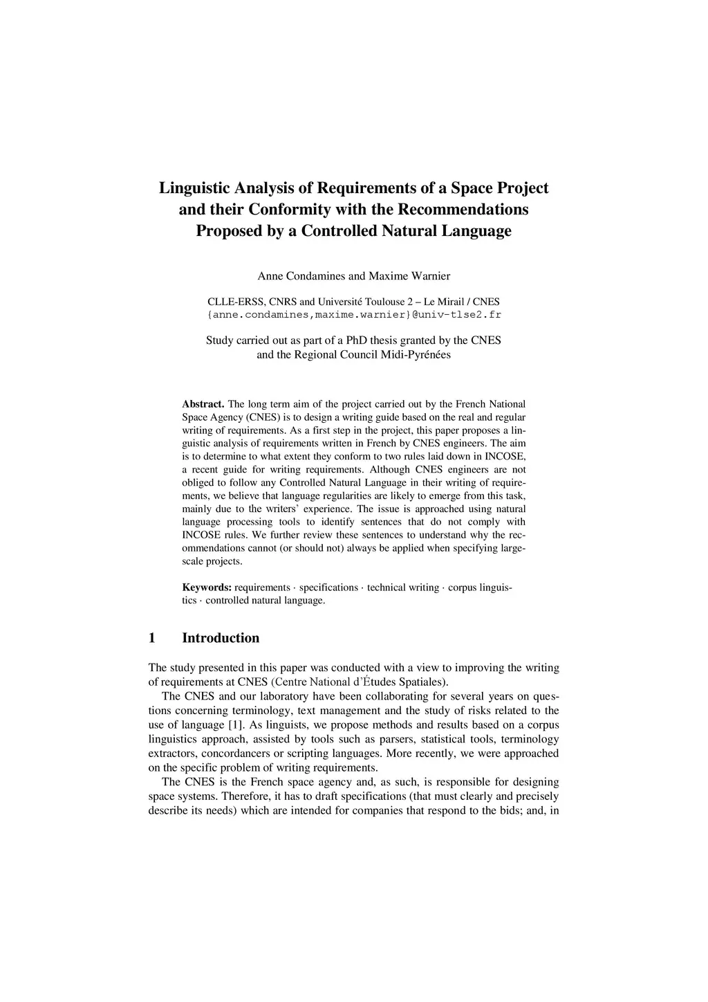 The long term aim of the project carried out by the French National Space Agency (CNES) is to design a writing guide based on the real and regular writing of requirements. As a first step in the project, this paper proposes a lin-guistic analysis of requirements written in French by CNES engineers. The aim is to determine to what extent they conform to two rules laid down in INCOSE, a recent guide for writing requirements. Although CNES engineers are not obliged to follow any Controlled Natural Language in their writing of requirements, we believe that language regularities are likely to emerge from this task, mainly due to the writers' experience. The issue is approached using natural language processing tools to identify sentences that do not comply with INCOSE rules. We further review these sentences to understand why the recommendations cannot (or should not) always be applied when specifying large-scale projects.