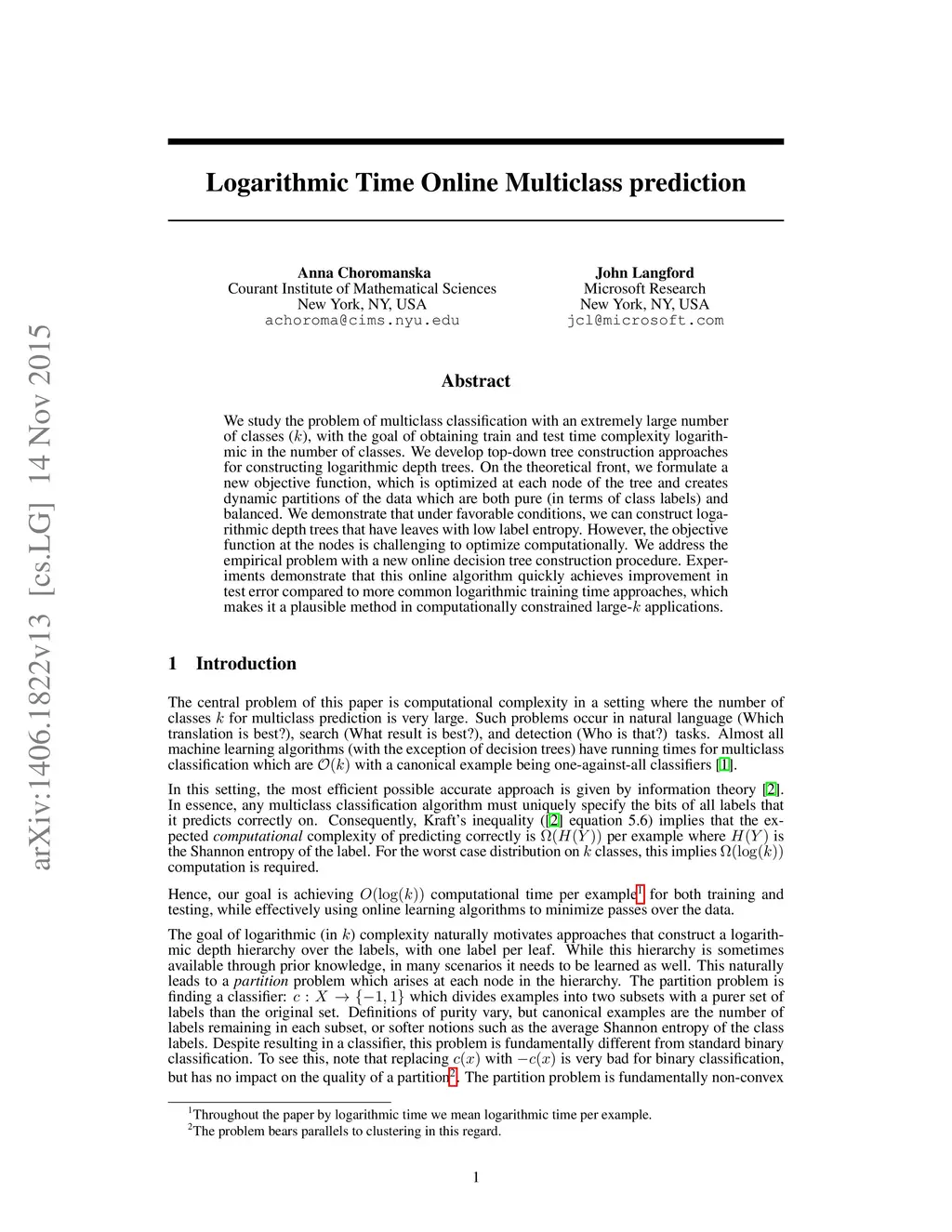 We study the problem of multiclass classification with an extremely large number of classes (k), with the goal of obtaining train and test time complexity logarithmic in the number of classes. We develop top-down tree construction approaches for constructing logarithmic depth trees. On the theoretical front, we formulate a new objective function, which is optimized at each node of the tree and creates dynamic partitions of the data which are both pure (in terms of class labels) and balanced. We demonstrate that under favorable conditions, we can construct logarithmic depth trees that have leaves with low label entropy. However, the objective function at the nodes is challenging to optimize computationally. We address the empirical problem with a new online decision tree construction procedure. Experiments demonstrate that this online algorithm quickly achieves improvement in test error compared to more common logarithmic training time approaches, which makes it a plausible method in computationally constrained large-k applications.