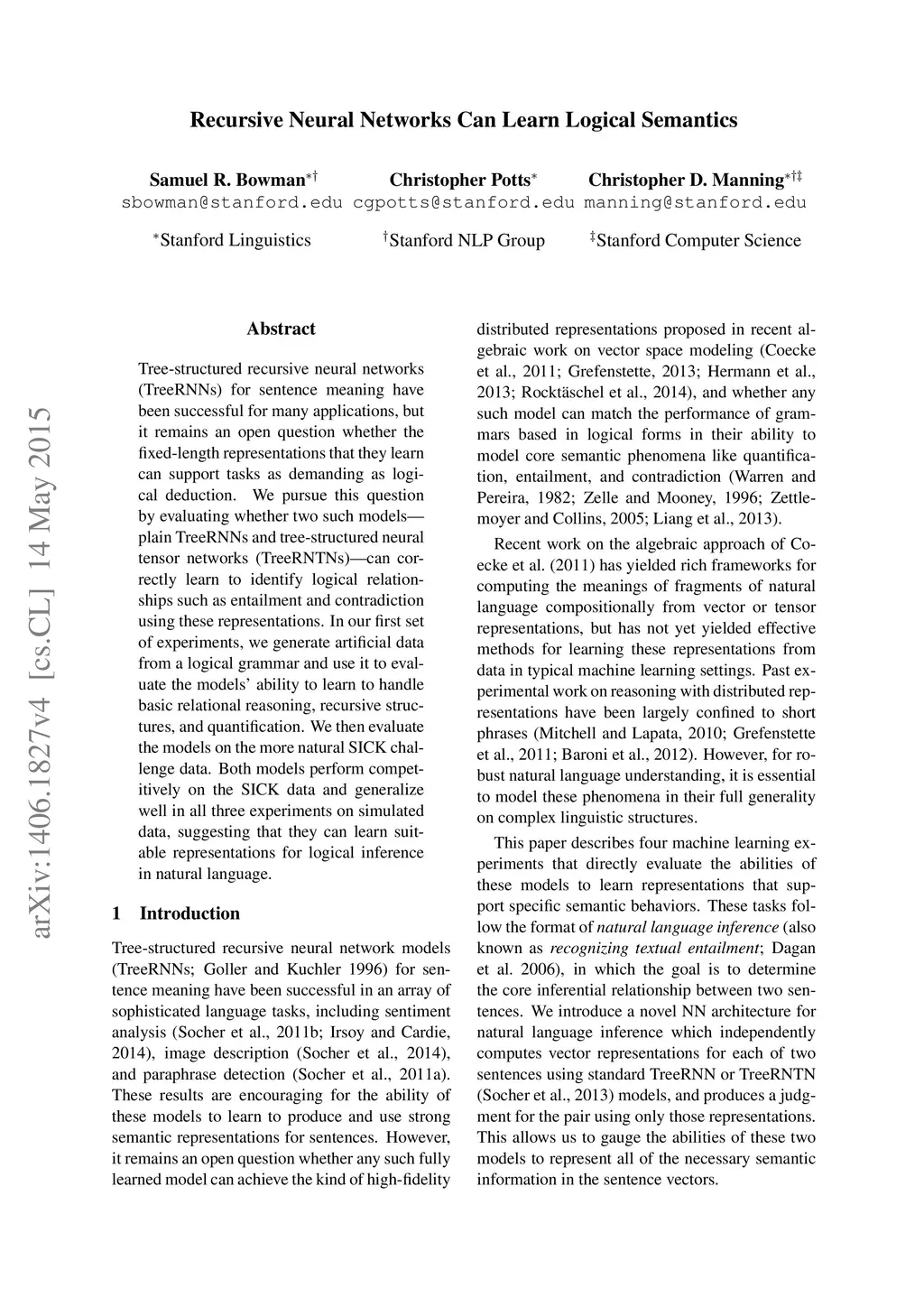Tree-structured recursive neural networks (TreeRNNs) for sentence meaning have been successful for many applications, but it remains an open question whether the fixed-length representations that they learn can support tasks as demanding as logical deduction. We pursue this question by evaluating whether two such models---plain TreeRNNs and tree-structured neural tensor networks (TreeRNTNs)---can correctly learn to identify logical relationships such as entailment and contradiction using these representations. In our first set of experiments, we generate artificial data from a logical grammar and use it to evaluate the models' ability to learn to handle basic relational reasoning, recursive structures, and quantification. We then evaluate the models on the more natural SICK challenge data. Both models perform competitively on the SICK data and generalize well in all three experiments on simulated data, suggesting that they can learn suitable representations for logical inference in natural language.