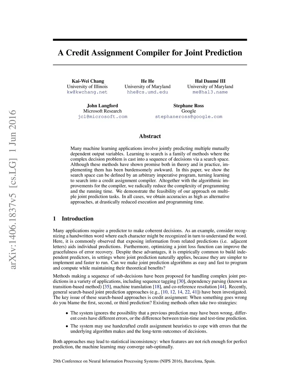 Many machine learning applications involve jointly predicting multiple mutually dependent output variables. Learning to search is a family of methods where the complex decision problem is cast into a sequence of decisions via a search space. Although these methods have shown promise both in theory and in practice, implementing them has been burdensomely awkward. In this paper, we show the search space can be defined by an arbitrary imperative program, turning learning to search into a credit assignment compiler. Altogether with the algorithmic improvements for the compiler, we radically reduce the complexity of programming and the running time. We demonstrate the feasibility of our approach on multiple joint prediction tasks. In all cases, we obtain accuracies as high as alternative approaches, at drastically reduced execution and programming time.
