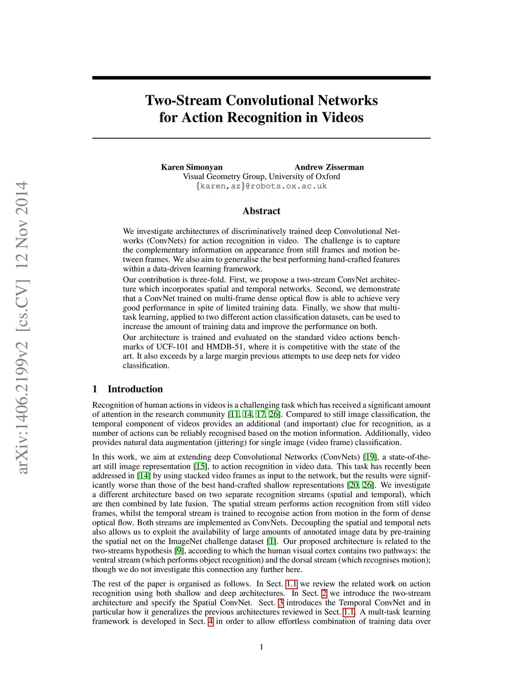 We investigate architectures of discriminatively trained deep Convolutional Networks (ConvNets) for action recognition in video. The challenge is to capture the complementary information on appearance from still frames and motion between frames. We also aim to generalise the best performing hand-crafted features within a data-driven learning framework. Our contribution is three-fold. First, we propose a two-stream ConvNet architecture which incorporates spatial and temporal networks. Second, we demonstrate that a ConvNet trained on multi-frame dense optical flow is able to achieve very good performance in spite of limited training data. Finally, we show that multi-task learning, applied to two different action classification datasets, can be used to increase the amount of training data and improve the performance on both. Our architecture is trained and evaluated on the standard video actions benchmarks of UCF-101 and HMDB-51, where it is competitive with the state of the art. It also exceeds by a large margin previous attempts to use deep nets for video classification.