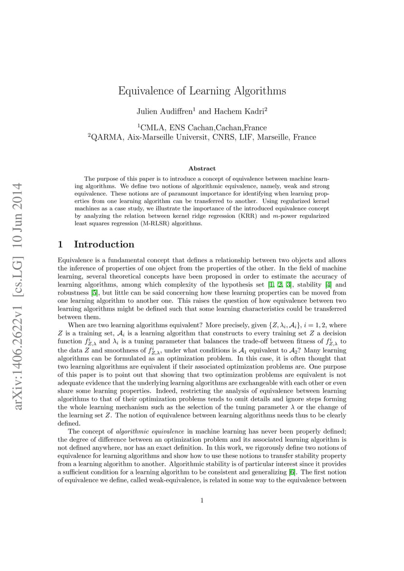 The purpose of this paper is to introduce a concept of equivalence between machine learning algorithms. We define two notions of algorithmic equivalence, namely, weak and strong equivalence. These notions are of paramount importance for identifying when learning prop erties from one learning algorithm can be transferred to another. Using regularized kernel machines as a case study, we illustrate the importance of the introduced equivalence concept by analyzing the relation between kernel ridge regression (KRR) and m-power regularized least squares regression (M-RLSR) algorithms.