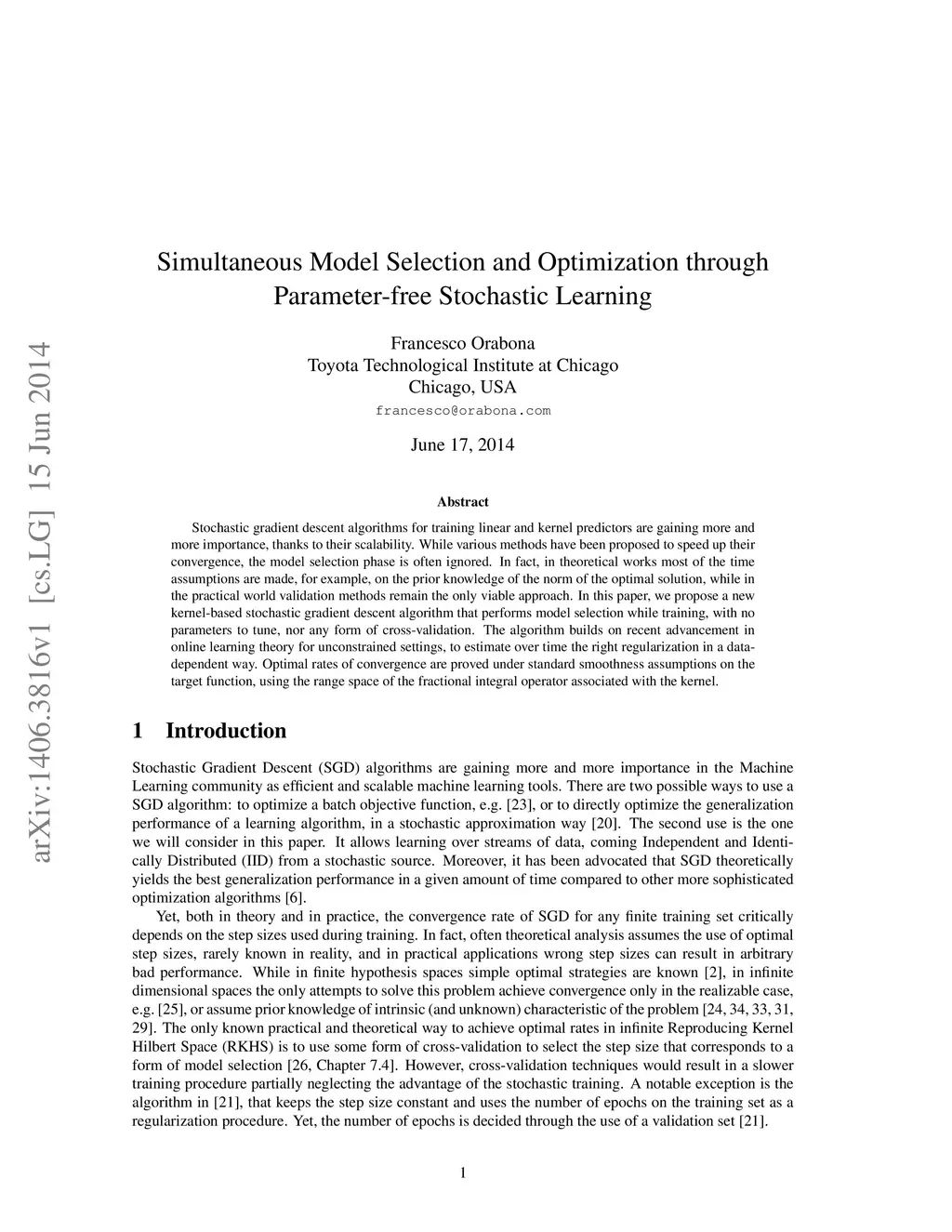 Stochastic gradient descent algorithms for training linear and kernel predictors are gaining more and more importance, thanks to their scalability. While various methods have been proposed to speed up their convergence, the model selection phase is often ignored. In fact, in theoretical works most of the time assumptions are made, for example, on the prior knowledge of the norm of the optimal solution, while in the practical world validation methods remain the only viable approach. In this paper, we propose a new kernel-based stochastic gradient descent algorithm that performs model selection while training, with no parameters to tune, nor any form of cross-validation. The algorithm builds on recent advancement in online learning theory for unconstrained settings, to estimate over time the right regularization in a data-dependent way. Optimal rates of convergence are proved under standard smoothness assumptions on the target function, using the range space of the fractional integral operator associated with the kernel.