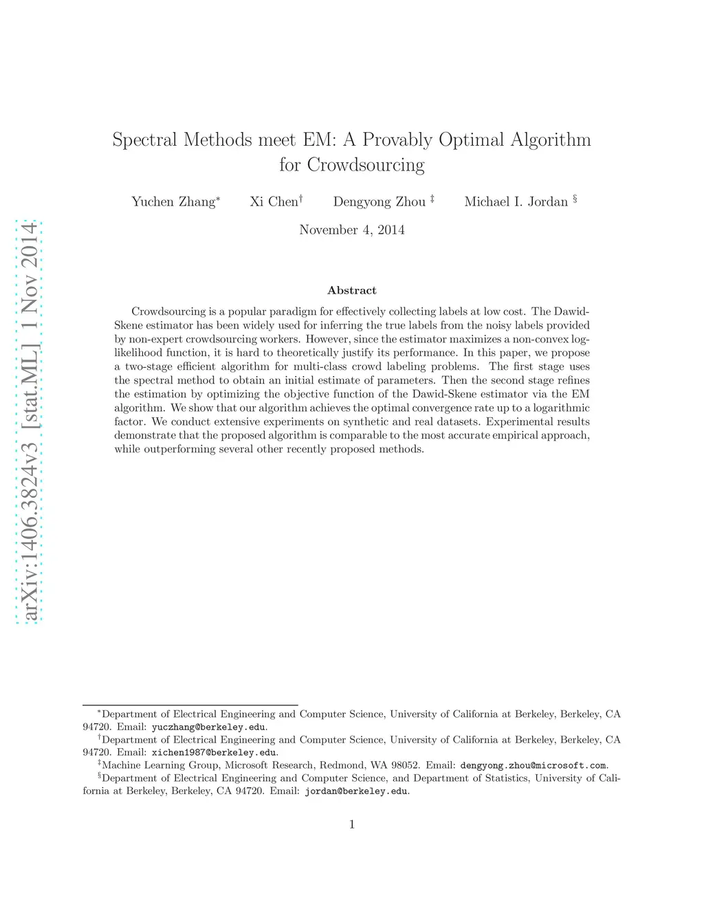 Spectral Methods meet EM: A Provably Optimal Algorithm for Crowdsourcing