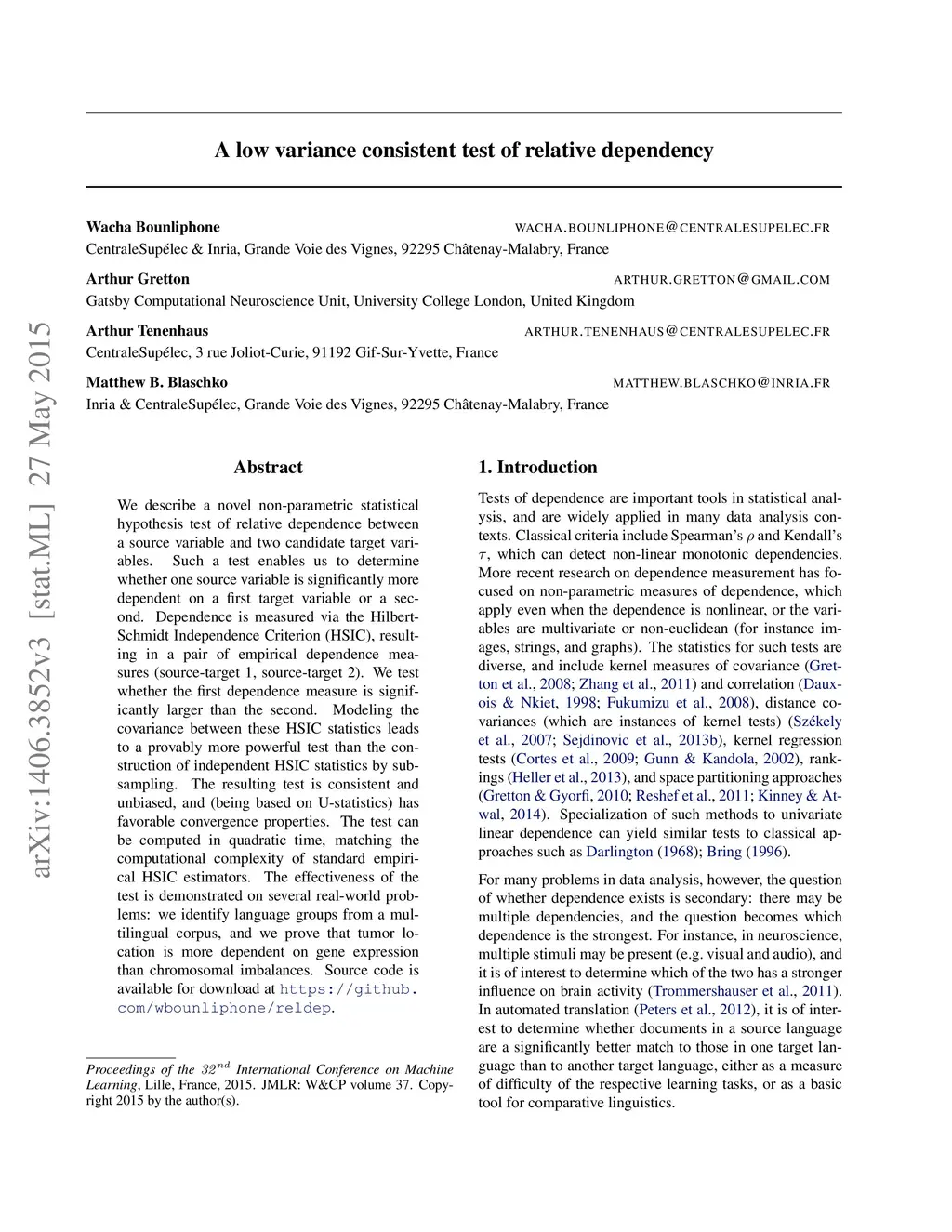 We describe a novel non-parametric statistical hypothesis test of relative dependence between a source variable and two candidate target variables. Such a test enables us to determine whether one source variable is significantly more dependent on a first target variable or a second. Dependence is measured via the Hilbert-Schmidt Independence Criterion (HSIC), resulting in a pair of empirical dependence measures (source-target 1, source-target 2). We test whether the first dependence measure is significantly larger than the second. Modeling the covariance between these HSIC statistics leads to a provably more powerful test than the construction of independent HSIC statistics by sub-sampling. The resulting test is consistent and unbiased, and (being based on U-statistics) has favorable convergence properties. The test can be computed in quadratic time, matching the computational complexity of standard empirical HSIC estimators. The effectiveness of the test is demonstrated on several real-world problems: we identify language groups from a multilingual corpus, and we prove that tumor location is more dependent on gene expression than chromosomal imbalances. Source code is available for download at https://github.com/wbounliphone/reldep.