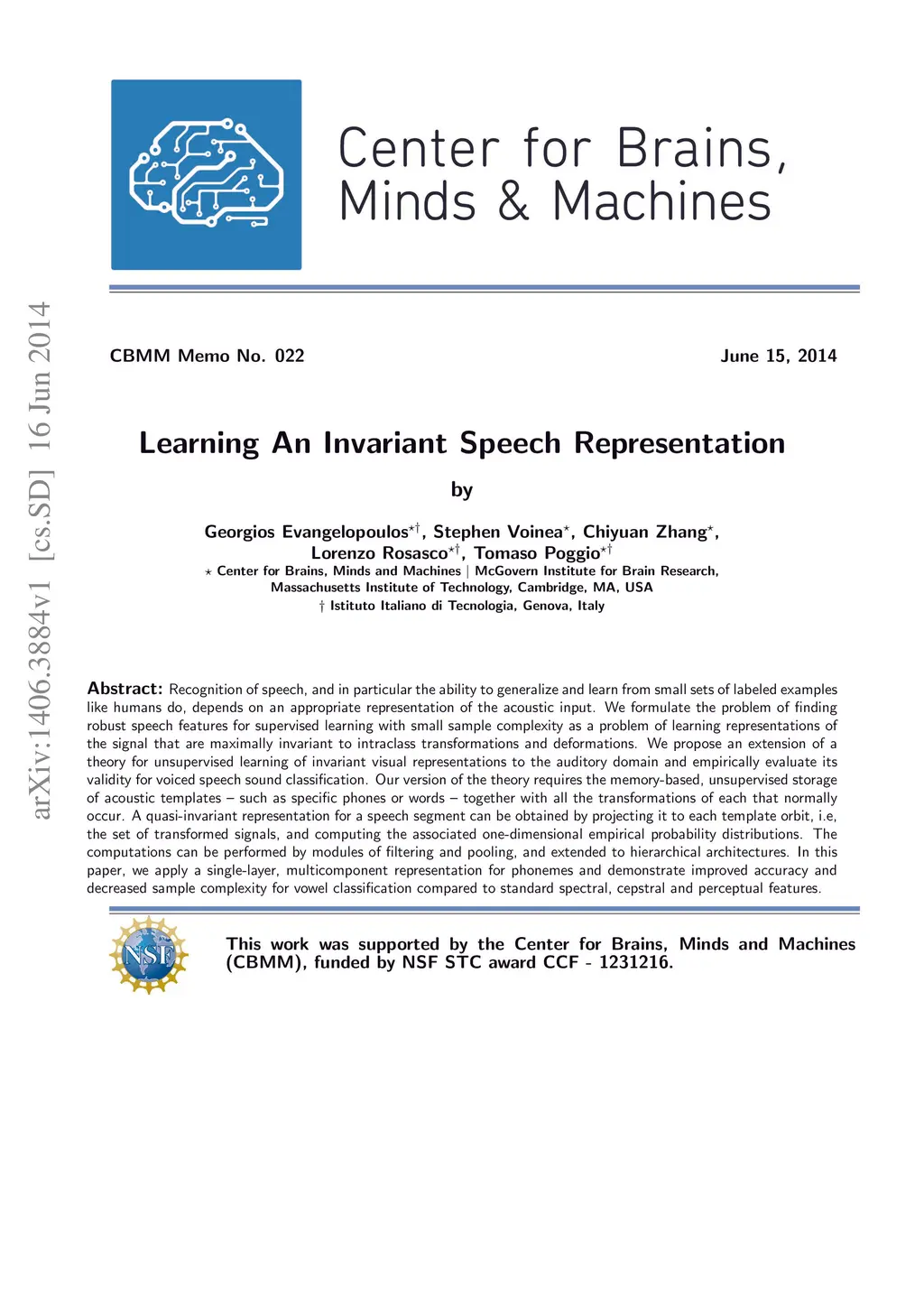 Recognition of speech, and in particular the ability to generalize and learn from small sets of labelled examples like humans do, depends on an appropriate representation of the acoustic input. We formulate the problem of finding robust speech features for supervised learning with small sample complexity as a problem of learning representations of the signal that are maximally invariant to intraclass transformations and deformations. We propose an extension of a theory for unsupervised learning of invariant visual representations to the auditory domain and empirically evaluate its validity for voiced speech sound classification. Our version of the theory requires the memory-based, unsupervised storage of acoustic templates -- such as specific phones or words -- together with all the transformations of each that normally occur. A quasi-invariant representation for a speech segment can be obtained by projecting it to each template orbit, i.e., the set of transformed signals, and computing the associated one-dimensional empirical probability distributions. The computations can be performed by modules of filtering and pooling, and extended to hierarchical architectures. In this paper, we apply a single-layer, multicomponent representation for phonemes and demonstrate improved accuracy and decreased sample complexity for vowel classification compared to standard spectral, cepstral and perceptual features.
