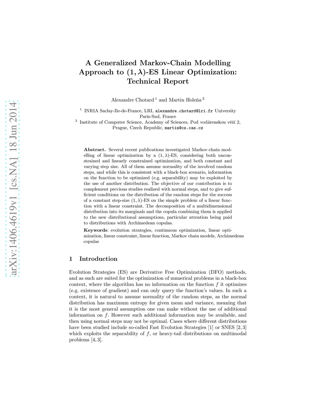 Several recent publications investigated Markov-chain modelling of linear optimization by a -ES, considering both unconstrained and linearly constrained optimization, and both constant and varying step size. All of them assume normality of the involved random steps, and while this is consistent with a black-box scenario, information on the function to be optimized (e.g. separability) may be exploited by the use of another distribution. The objective of our contribution is to complement previous studies realized with normal steps, and to give sufficient conditions on the distribution of the random steps for the success of a constant step-size -ES on the simple problem of a linear function with a linear constraint. The decomposition of a multidimensional distribution into its marginals and the copula combining them is applied to the new distributional assumptions, particular attention being paid to distributions with Archimedean copulas.