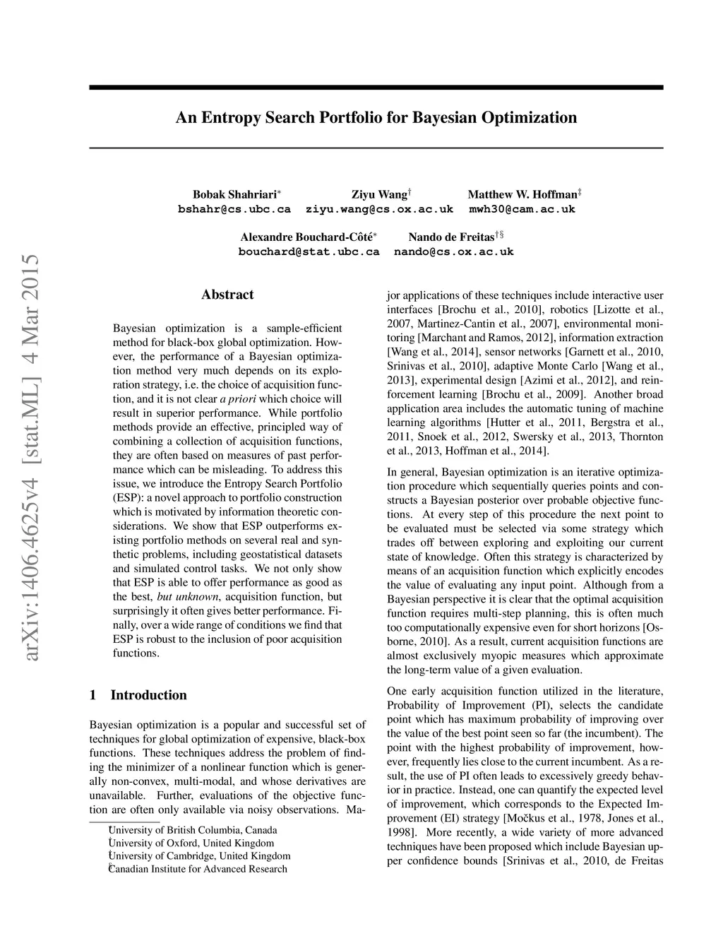 Bayesian optimization is a sample-efficient method for black-box global optimization. How- ever, the performance of a Bayesian optimization method very much depends on its exploration strategy, i.e. the choice of acquisition function, and it is not clear a priori which choice will result in superior performance. While portfolio methods provide an effective, principled way of combining a collection of acquisition functions, they are often based on measures of past performance which can be misleading. To address this issue, we introduce the Entropy Search Portfolio (ESP): a novel approach to portfolio construction which is motivated by information theoretic considerations. We show that ESP outperforms existing portfolio methods on several real and synthetic problems, including geostatistical datasets and simulated control tasks. We not only show that ESP is able to offer performance as good as the best, but unknown, acquisition function, but surprisingly it often gives better performance. Finally, over a wide range of conditions we find that ESP is robust to the inclusion of poor acquisition functions.
