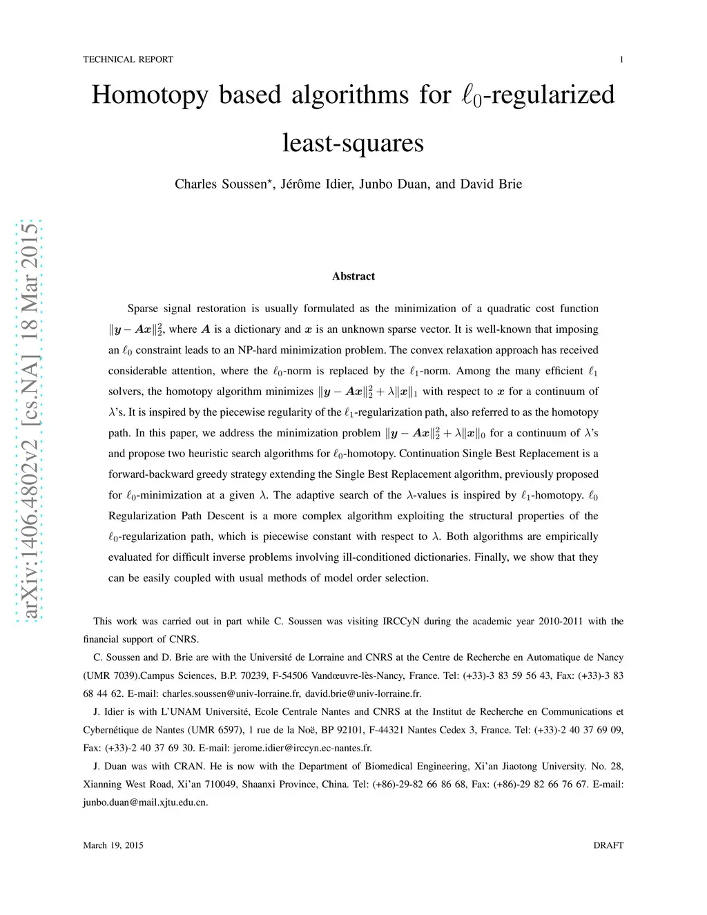 Sparse signal restoration is usually formulated as the minimization of a quadratic cost function , where A is a dictionary and x is an unknown sparse vector. It is well-known that imposing an constraint leads to an NP-hard minimization problem. The convex relaxation approach has received considerable attention, where the -norm is replaced by the -norm. Among the many efficient solvers, the homotopy algorithm minimizes with respect to x for a continuum of 's. It is inspired by the piecewise regularity of the -regularization path, also referred to as the homotopy path. In this paper, we address the minimization problem for a continuum of 's and propose two heuristic search algorithms for -homotopy. Continuation Single Best Replacement is a forward-backward greedy strategy extending the Single Best Replacement algorithm, previously proposed for -minimization at a given . The adaptive search of the -values is inspired by -homotopy. Regularization Path Descent is a more complex algorithm exploiting the structural properties of the -regularization path, which is piecewise constant with respect to . Both algorithms are empirically evaluated for difficult inverse problems involving ill-conditioned dictionaries. Finally, we show that they can be easily coupled with usual methods of model order selection.