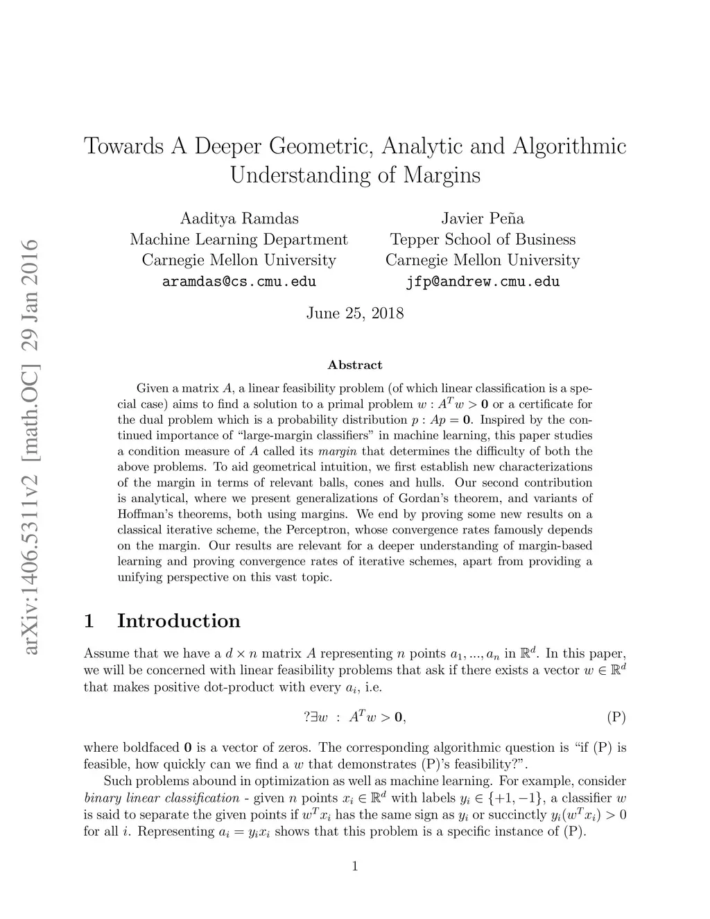 Given a matrix , a linear feasibility problem (of which linear classification is a special case) aims to find a solution to a primal problem or a certificate for the dual problem which is a probability distribution . Inspired by the continued importance of "large-margin classifiers" in machine learning, this paper studies a condition measure of called its \textit{margin} that determines the difficulty of both the above problems. To aid geometrical intuition, we first establish new characterizations of the margin in terms of relevant balls, cones and hulls. Our second contribution is analytical, where we present generalizations of Gordan's theorem, and variants of Hoffman's theorems, both using margins. We end by proving some new results on a classical iterative scheme, the Perceptron, whose convergence rates famously depends on the margin. Our results are relevant for a deeper understanding of margin-based learning and proving convergence rates of iterative schemes, apart from providing a unifying perspective on this vast topic.