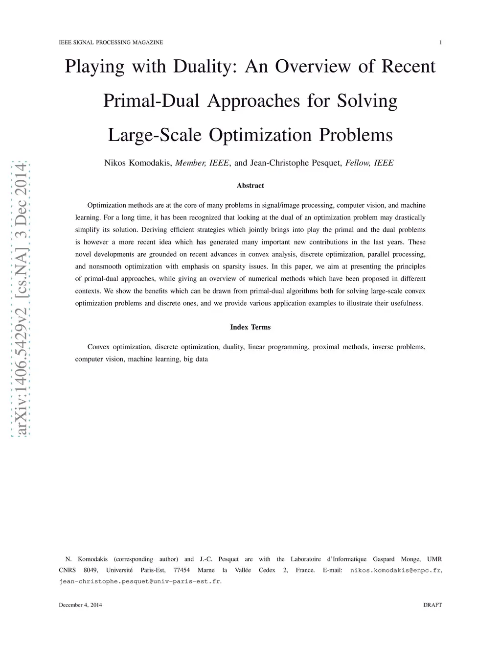Optimization methods are at the core of many problems in signal/image processing, computer vision, and machine learning. For a long time, it has been recognized that looking at the dual of an optimization problem may drastically simplify its solution. Deriving efficient strategies which jointly brings into play the primal and the dual problems is however a more recent idea which has generated many important new contributions in the last years. These novel developments are grounded on recent advances in convex analysis, discrete optimization, parallel processing, and non-smooth optimization with emphasis on sparsity issues. In this paper, we aim at presenting the principles of primal-dual approaches, while giving an overview of numerical methods which have been proposed in different contexts. We show the benefits which can be drawn from primal-dual algorithms both for solving large-scale convex optimization problems and discrete ones, and we provide various application examples to illustrate their usefulness.
