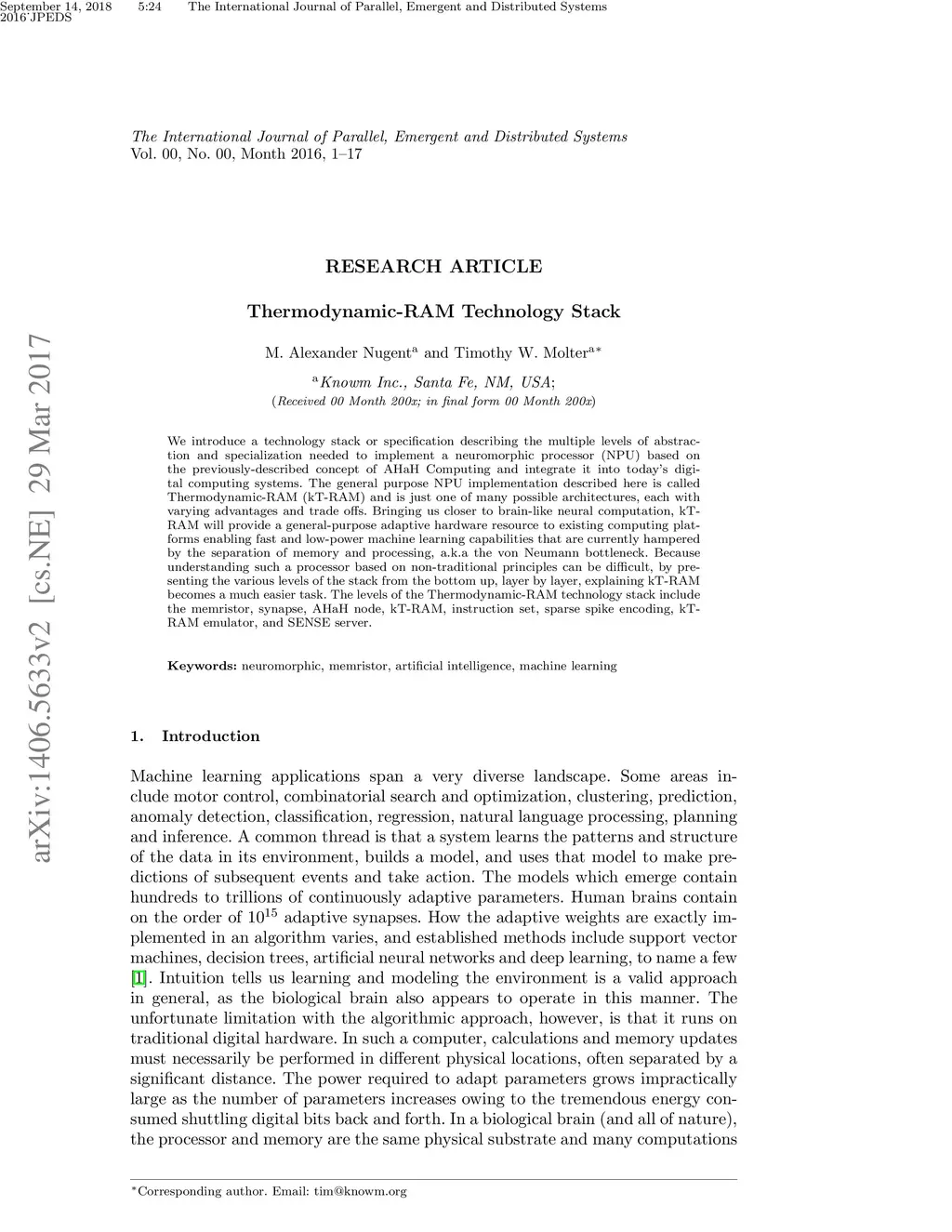We introduce a technology stack or specification describing the multiple levels of abstraction and specialization needed to implement a neuromorphic processor (NPU) based on the previously-described concept of AHaH Computing and integrate it into today's digital computing systems. The general purpose NPU implementation described here is called Thermodynamic-RAM (kT-RAM) and is just one of many possible architectures, each with varying advantages and trade offs. Bringing us closer to brain-like neural computation, kT-RAM will provide a general-purpose adaptive hardware resource to existing computing platforms enabling fast and low-power machine learning capabilities that are currently hampered by the separation of memory and processing, a.k.a the von Neumann bottleneck. Because understanding such a processor based on non-traditional principles can be difficult, by presenting the various levels of the stack from the bottom up, layer by layer, explaining kT-RAM becomes a much easier task. The levels of the Thermodynamic-RAM technology stack include the memristor, synapse, AHaH node, kT-RAM, instruction set, sparse spike encoding, kT-RAM emulator, and SENSE server.