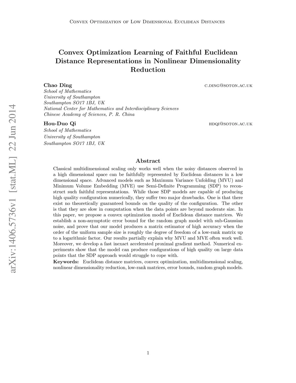 Classical multidimensional scaling only works well when the noisy distances observed in a high dimensional space can be faithfully represented by Euclidean distances in a low dimensional space. Advanced models such as Maximum Variance Unfolding (MVU) and Minimum Volume Embedding (MVE) use Semi-Definite Programming (SDP) to reconstruct such faithful representations. While those SDP models are capable of producing high quality configuration numerically, they suffer two major drawbacks. One is that there exist no theoretically guaranteed bounds on the quality of the configuration. The other is that they are slow in computation when the data points are beyond moderate size. In this paper, we propose a convex optimization model of Euclidean distance matrices. We establish a non-asymptotic error bound for the random graph model with sub-Gaussian noise, and prove that our model produces a matrix estimator of high accuracy when the order of the uniform sample size is roughly the degree of freedom of a low-rank matrix up to a logarithmic factor. Our results partially explain why MVU and MVE often work well. Moreover, we develop a fast inexact accelerated proximal gradient method. Numerical experiments show that the model can produce configurations of high quality on large data points that the SDP approach would struggle to cope with.