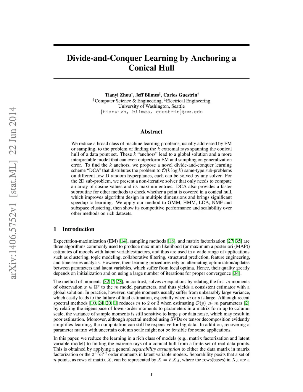 We reduce a broad class of machine learning problems, usually addressed by EM or sampling, to the problem of finding the extremal rays spanning the conical hull of a data point set. These "anchors" lead to a global solution and a more interpretable model that can even outperform EM and sampling on generalization error. To find the anchors, we propose a novel divide-and-conquer learning scheme "DCA" that distributes the problem to same-type sub-problems on different low-D random hyperplanes, each can be solved by any solver. For the 2D sub-problem, we present a non-iterative solver that only needs to compute an array of cosine values and its max/min entries. DCA also provides a faster subroutine for other methods to check whether a point is covered in a conical hull, which improves algorithm design in multiple dimensions and brings significant speedup to learning. We apply our method to GMM, HMM, LDA, NMF and subspace clustering, then show its competitive performance and scalability over other methods on rich datasets.
