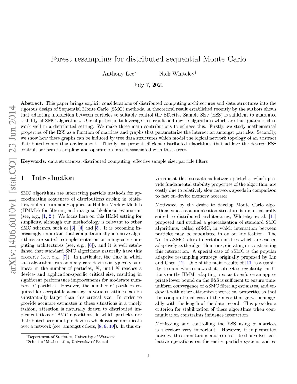 This paper brings explicit considerations of distributed computing architectures and data structures into the rigorous design of Sequential Monte Carlo (SMC) methods. A theoretical result established recently by the authors shows that adapting interaction between particles to suitably control the Effective Sample Size (ESS) is sufficient to guarantee stability of SMC algorithms. Our objective is to leverage this result and devise algorithms which are thus guaranteed to work well in a distributed setting. We make three main contributions to achieve this. Firstly, we study mathematical properties of the ESS as a function of matrices and graphs that parameterize the interaction amongst particles. Secondly, we show how these graphs can be induced by tree data structures which model the logical network topology of an abstract distributed computing environment. Thirdly, we present efficient distributed algorithms that achieve the desired ESS control, perform resampling and operate on forests associated with these trees.