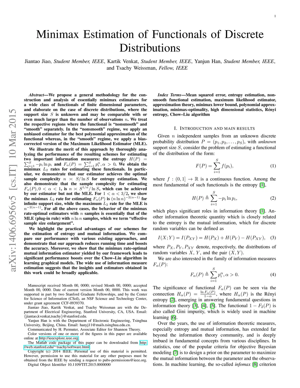 We propose a general methodology for the construction and analysis of minimax estimators for a wide class of functionals of finite dimensional parameters, and elaborate on the case of discrete distributions, where the alphabet size is unknown and may be comparable with the number of observations . We treat the respective regions where the functional is "nonsmooth" and "smooth" separately. In the "nonsmooth" regime, we apply an unbiased estimator for the best polynomial approximation of the functional whereas, in the "smooth" regime, we apply a bias-corrected Maximum Likelihood Estimator (MLE). We illustrate the merit of this approach by thoroughly analyzing two important cases: the entropy and . We obtain the minimax rates for estimating these functionals. In particular, we demonstrate that our estimator achieves the optimal sample complexity for entropy estimation. We also show that the sample complexity for estimating is , which can be achieved by our estimator but not the MLE. For , we show the minimax rate for estimating is regardless of the alphabet size, while the rate for the MLE is . For all the above cases, the behavior of the minimax rate-optimal estimators with samples is essentially that of the MLE with samples. We highlight the practical advantages of our schemes for entropy and mutual information estimation. We demonstrate that our approach reduces running time and boosts the accuracy compared to existing various approaches. Moreover, we show that the mutual information estimator induced by our methodology leads to significant performance boosts over the Chow--Liu algorithm in learning graphical models.