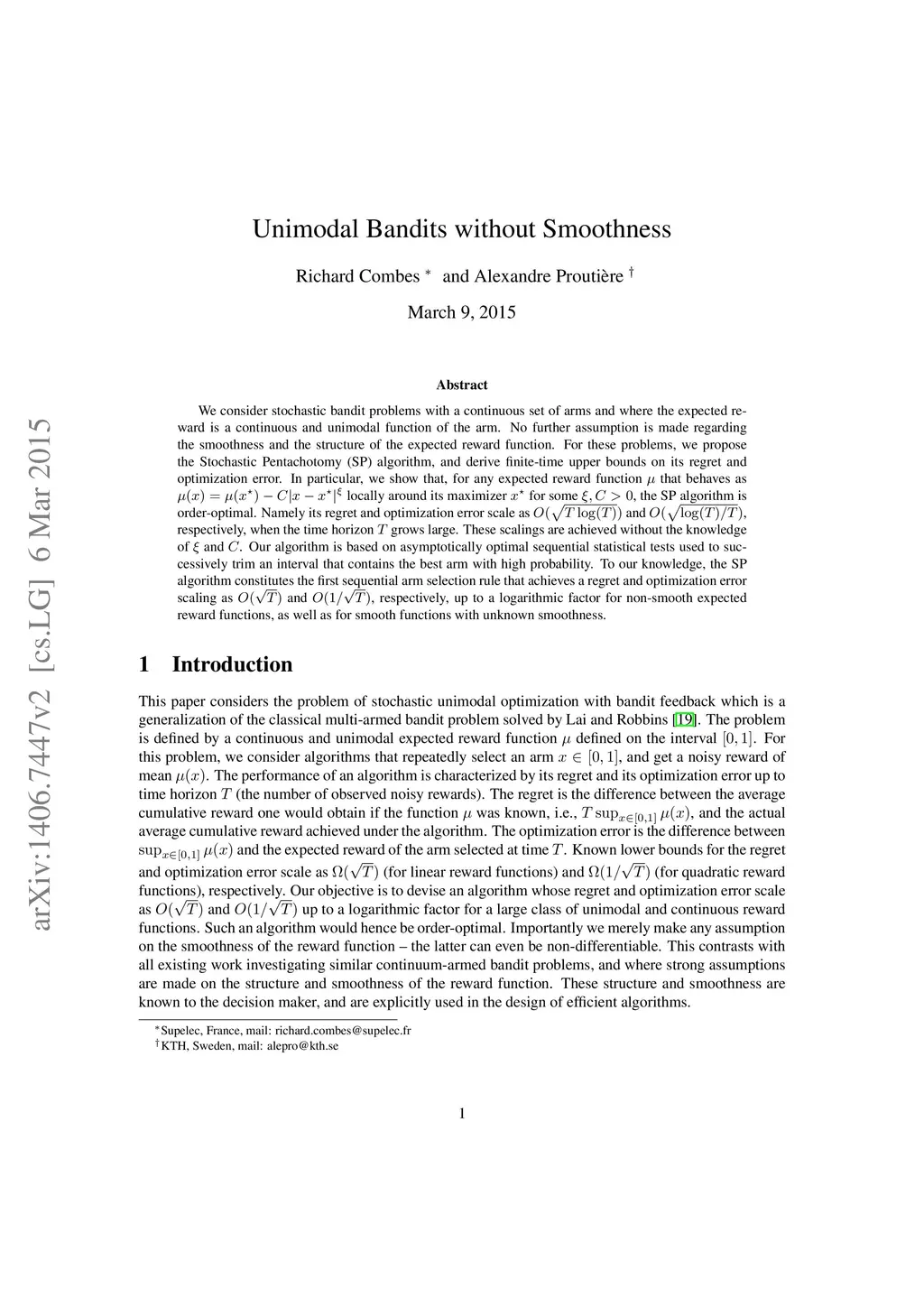 We consider stochastic bandit problems with a continuous set of arms and where the expected reward is a continuous and unimodal function of the arm. No further assumption is made regarding the smoothness and the structure of the expected reward function. For these problems, we propose the Stochastic Pentachotomy (SP) algorithm, and derive finite-time upper bounds on its regret and optimization error. In particular, we show that, for any expected reward function that behaves as locally around its maximizer for some , the SP algorithm is order-optimal. Namely its regret and optimization error scale as and , respectively, when the time horizon grows large. These scalings are achieved without the knowledge of and . Our algorithm is based on asymptotically optimal sequential statistical tests used to successively trim an interval that contains the best arm with high probability. To our knowledge, the SP algorithm constitutes the first sequential arm selection rule that achieves a regret and optimization error scaling as and , respectively, up to a logarithmic factor for non-smooth expected reward functions, as well as for smooth functions with unknown smoothness.