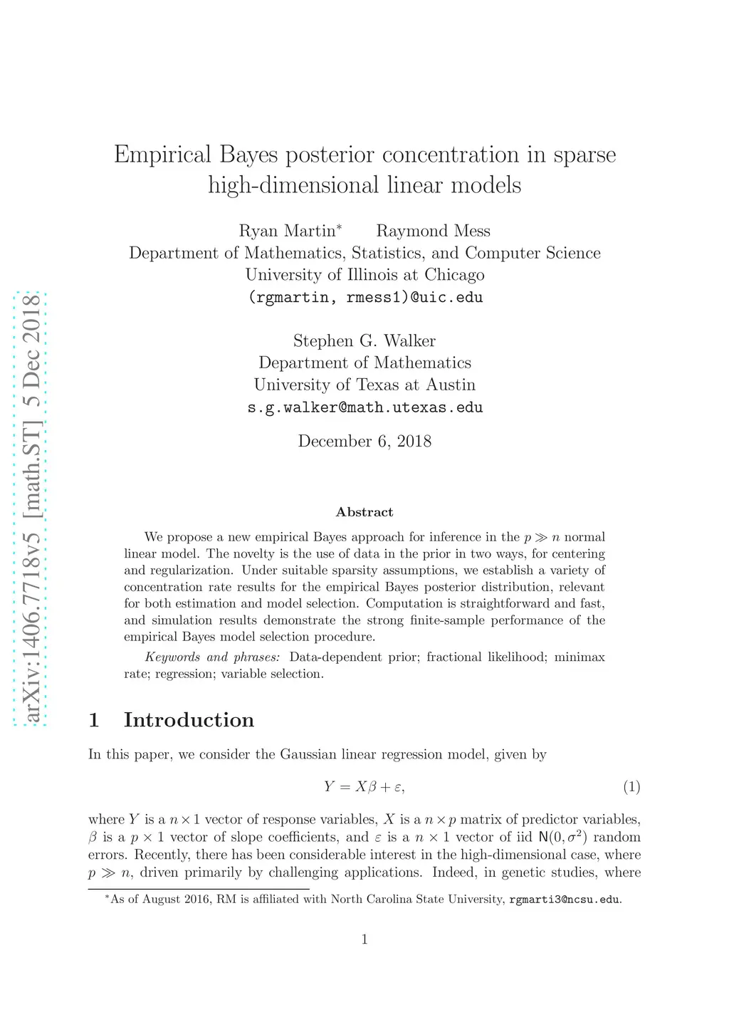 We propose a new empirical Bayes approach for inference in the normal linear model. The novelty is the use of data in the prior in two ways, for centering and regularization. Under suitable sparsity assumptions, we establish a variety of concentration rate results for the empirical Bayes posterior distribution, relevant for both estimation and model selection. Computation is straightforward and fast, and simulation results demonstrate the strong finite-sample performance of the empirical Bayes model selection procedure.