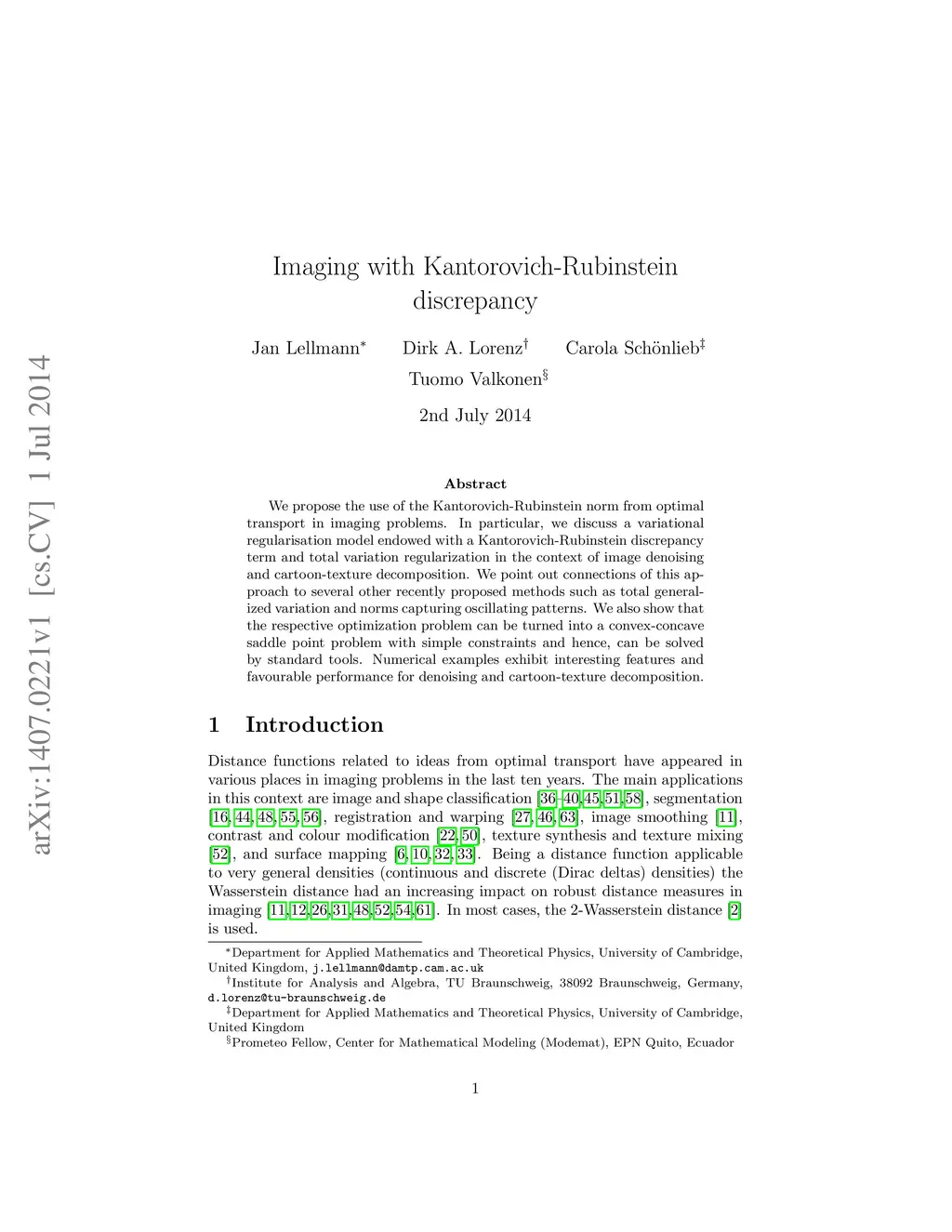 We propose the use of the Kantorovich-Rubinstein norm from optimal transport in imaging problems. In particular, we discuss a variational regularisation model endowed with a Kantorovich-Rubinstein discrepancy term and total variation regularization in the context of image denoising and cartoon-texture decomposition. We point out connections of this approach to several other recently proposed methods such as total generalized variation and norms capturing oscillating patterns. We also show that the respective optimization problem can be turned into a convex-concave saddle point problem with simple constraints and hence, can be solved by standard tools. Numerical examples exhibit interesting features and favourable performance for denoising and cartoon-texture decomposition.