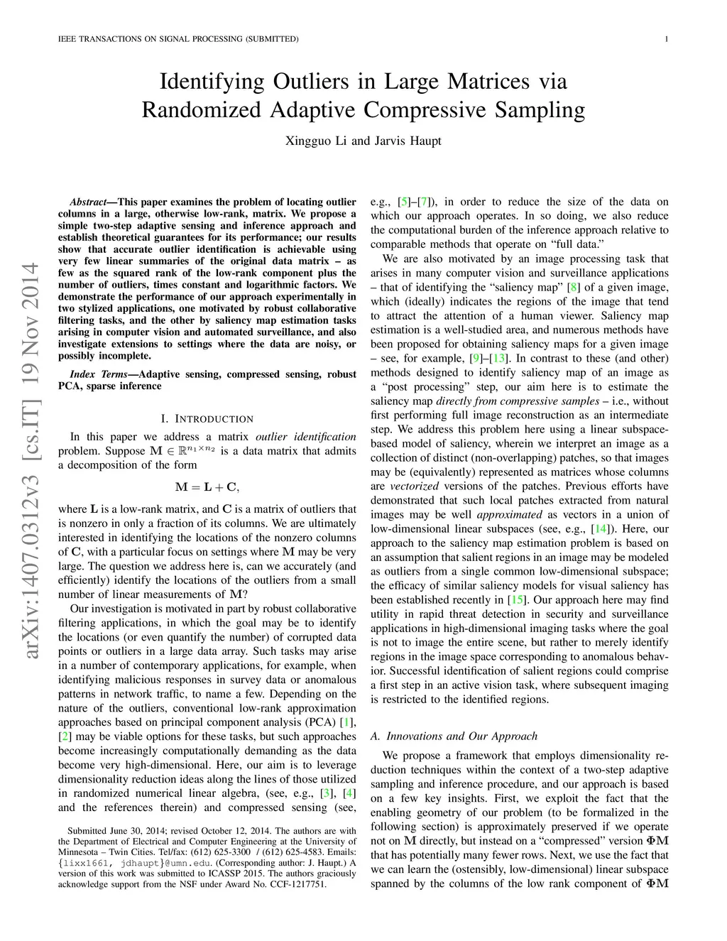 Identifying Outliers in Large Matrices via Randomized Adaptive