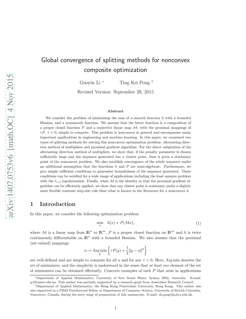 We consider the problem of minimizing the sum of a smooth function with a bounded Hessian, and a nonsmooth function. We assume that the latter function is a composition of a proper closed function and a surjective linear map , with the proximal mappings of , , simple to compute. This problem is nonconvex in general and encompasses many important applications in engineering and machine learning. In this paper, we examined two types of splitting methods for solving this nonconvex optimization problem: alternating direction method of multipliers and proximal gradient algorithm. For the direct adaptation of the alternating direction method of multipliers, we show that, if the penalty parameter is chosen sufficiently large and the sequence generated has a cluster point, then it gives a stationary point of the nonconvex problem. We also establish convergence of the whole sequence under an additional assumption that the functions and are semi-algebraic. Furthermore, we give simple sufficient conditions to guarantee boundedness of the sequence generated. These conditions can be satisfied for a wide range of applications including the least squares problem with the regularization. Finally, when is the identity so that the proximal gradient algorithm can be efficiently applied, we show that any cluster point is stationary under a slightly more flexible constant step-size rule than what is known in the literature for a nonconvex .