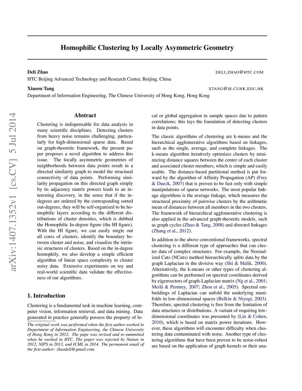 Clustering is indispensable for data analysis in many scientific disciplines. Detecting clusters from heavy noise remains challenging, particularly for high-dimensional sparse data. Based on graph-theoretic framework, the present paper proposes a novel algorithm to address this issue. The locally asymmetric geometries of neighborhoods between data points result in a directed similarity graph to model the structural connectivity of data points. Performing similarity propagation on this directed graph simply by its adjacency matrix powers leads to an interesting discovery, in the sense that if the in-degrees are ordered by the corresponding sorted out-degrees, they will be self-organized to be homophilic layers according to the different distributions of cluster densities, which is dubbed the Homophilic In-degree figure (the HI figure). With the HI figure, we can easily single out all cores of clusters, identify the boundary between cluster and noise, and visualize the intrinsic structures of clusters. Based on the in-degree homophily, we also develop a simple efficient algorithm of linear space complexity to cluster noisy data. Extensive experiments on toy and real-world scientific data validate the effectiveness of our algorithms.