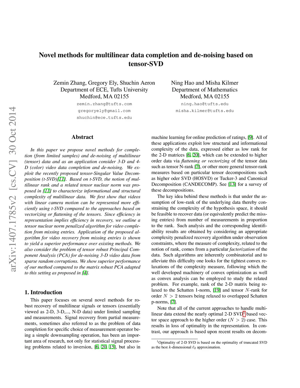 Novel methods for multilinear data completion and de-noising based on