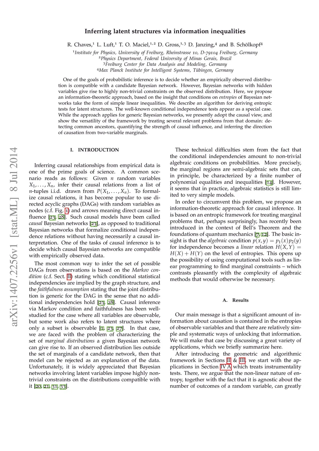 One of the goals of probabilistic inference is to decide whether an empirically observed distribution is compatible with a candidate Bayesian network. However, Bayesian networks with hidden variables give rise to highly non-trivial constraints on the observed distribution. Here, we propose an information-theoretic approach, based on the insight that conditions on entropies of Bayesian networks take the form of simple linear inequalities. We describe an algorithm for deriving entropic tests for latent structures. The well-known conditional independence tests appear as a special case. While the approach applies for generic Bayesian networks, we presently adopt the causal view, and show the versatility of the framework by treating several relevant problems from that domain: detecting common ancestors, quantifying the strength of causal influence, and inferring the direction of causation from two-variable marginals.
