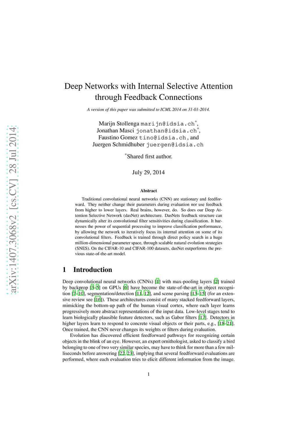 Traditional convolutional neural networks (CNN) are stationary and feedforward. They neither change their parameters during evaluation nor use feedback from higher to lower layers. Real brains, however, do. So does our Deep Attention Selective Network (dasNet) architecture. DasNets feedback structure can dynamically alter its convolutional filter sensitivities during classification. It harnesses the power of sequential processing to improve classification performance, by allowing the network to iteratively focus its internal attention on some of its convolutional filters. Feedback is trained through direct policy search in a huge million-dimensional parameter space, through scalable natural evolution strategies (SNES). On the CIFAR-10 and CIFAR-100 datasets, dasNet outperforms the previous state-of-the-art model.