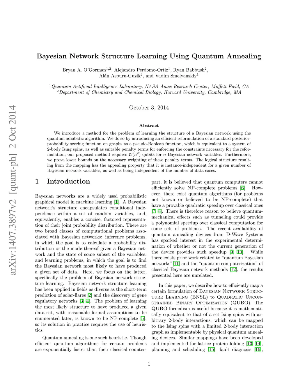 We introduce a method for the problem of learning the structure of a Bayesian network using the quantum adiabatic algorithm. We do so by introducing an efficient reformulation of a standard posterior-probability scoring function on graphs as a pseudo-Boolean function, which is equivalent to a system of 2-body Ising spins, as well as suitable penalty terms for enforcing the constraints necessary for the reformulation; our proposed method requires qubits for Bayesian network variables. Furthermore, we prove lower bounds on the necessary weighting of these penalty terms. The logical structure resulting from the mapping has the appealing property that it is instance-independent for a given number of Bayesian network variables, as well as being independent of the number of data cases.