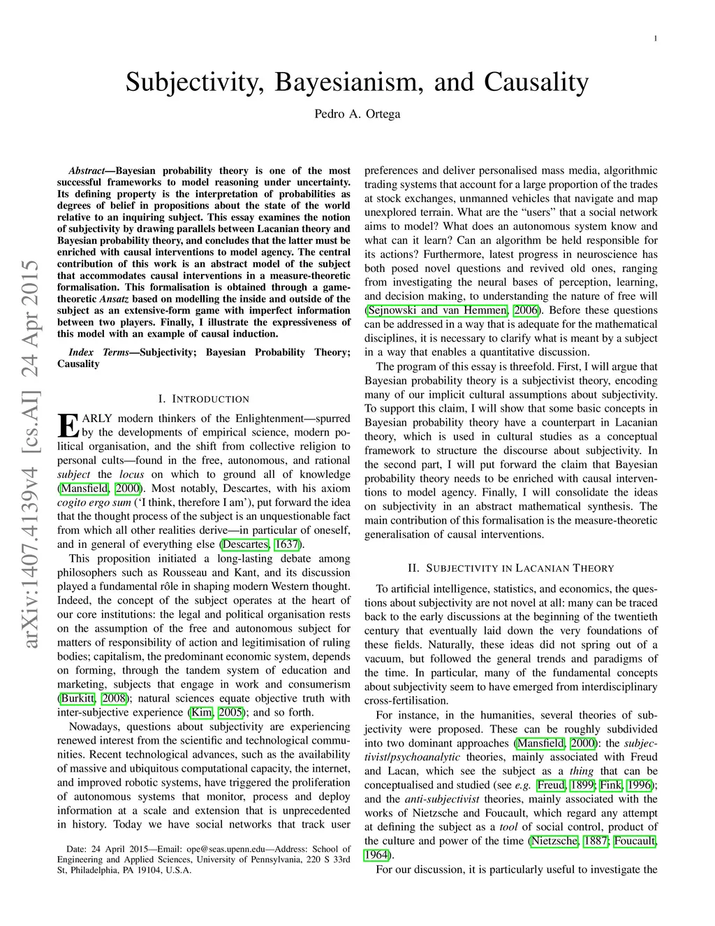 Bayesian probability theory is one of the most successful frameworks to model reasoning under uncertainty. Its defining property is the interpretation of probabilities as degrees of belief in propositions about the state of the world relative to an inquiring subject. This essay examines the notion of subjectivity by drawing parallels between Lacanian theory and Bayesian probability theory, and concludes that the latter must be enriched with causal interventions to model agency. The central contribution of this work is an abstract model of the subject that accommodates causal interventions in a measure-theoretic formalisation. This formalisation is obtained through a game-theoretic Ansatz based on modelling the inside and outside of the subject as an extensive-form game with imperfect information between two players. Finally, I illustrate the expressiveness of this model with an example of causal induction.