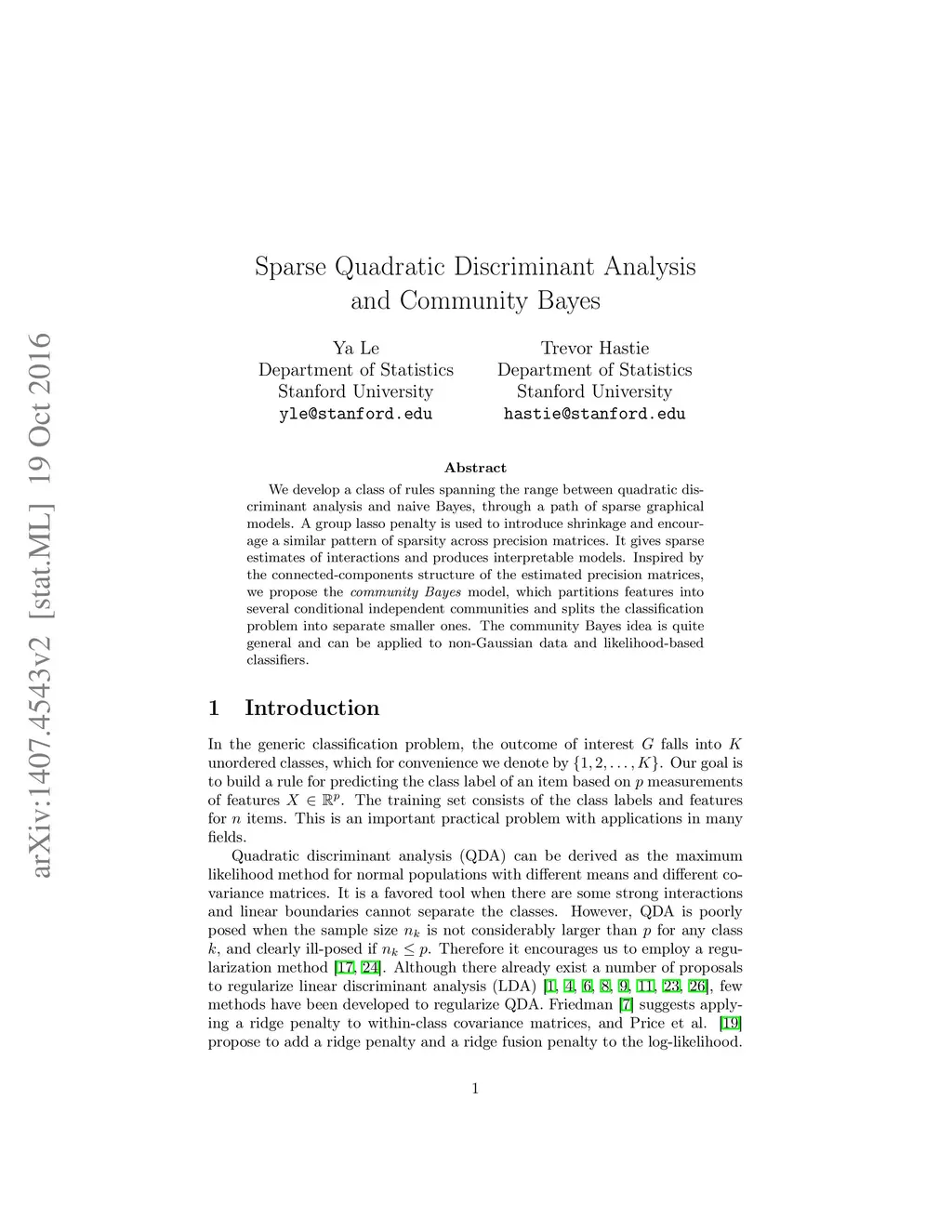 Sparse Quadratic Discriminant Analysis and Community Bayes
