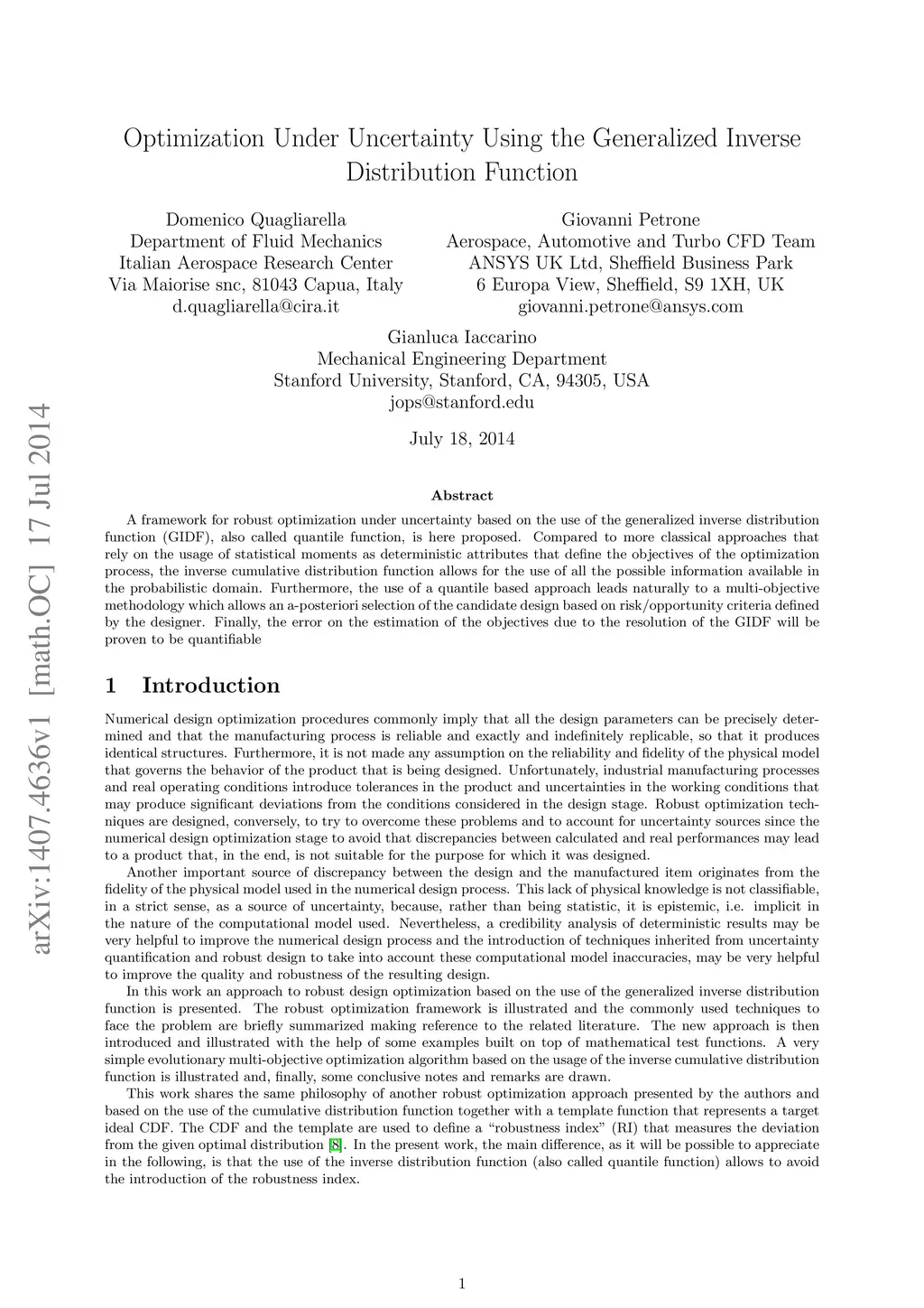 A framework for robust optimization under uncertainty based on the use of the generalized inverse distribution function (GIDF), also called quantile function, is here proposed. Compared to more classical approaches that rely on the usage of statistical moments as deterministic attributes that define the objectives of the optimization process, the inverse cumulative distribution function allows for the use of all the possible information available in the probabilistic domain. Furthermore, the use of a quantile based approach leads naturally to a multi-objective methodology which allows an a-posteriori selection of the candidate design based on risk/opportunity criteria defined by the designer. Finally, the error on the estimation of the objectives due to the resolution of the GIDF will be proven to be quantifiable