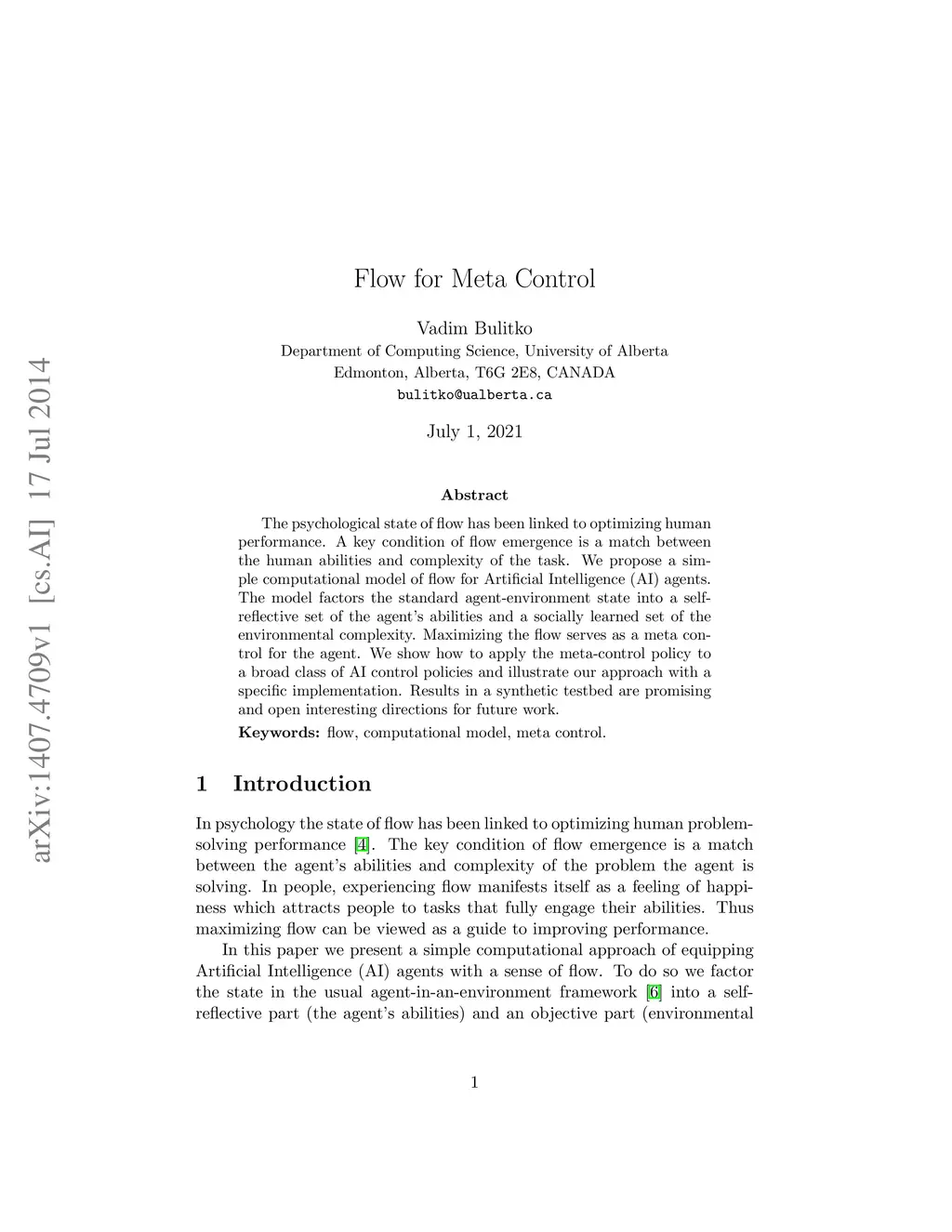The psychological state of flow has been linked to optimizing human performance. A key condition of flow emergence is a match between the human abilities and complexity of the task. We propose a simple computational model of flow for Artificial Intelligence (AI) agents. The model factors the standard agent-environment state into a self-reflective set of the agent's abilities and a socially learned set of the environmental complexity. Maximizing the flow serves as a meta control for the agent. We show how to apply the meta-control policy to a broad class of AI control policies and illustrate our approach with a specific implementation. Results in a synthetic testbed are promising and open interesting directions for future work.